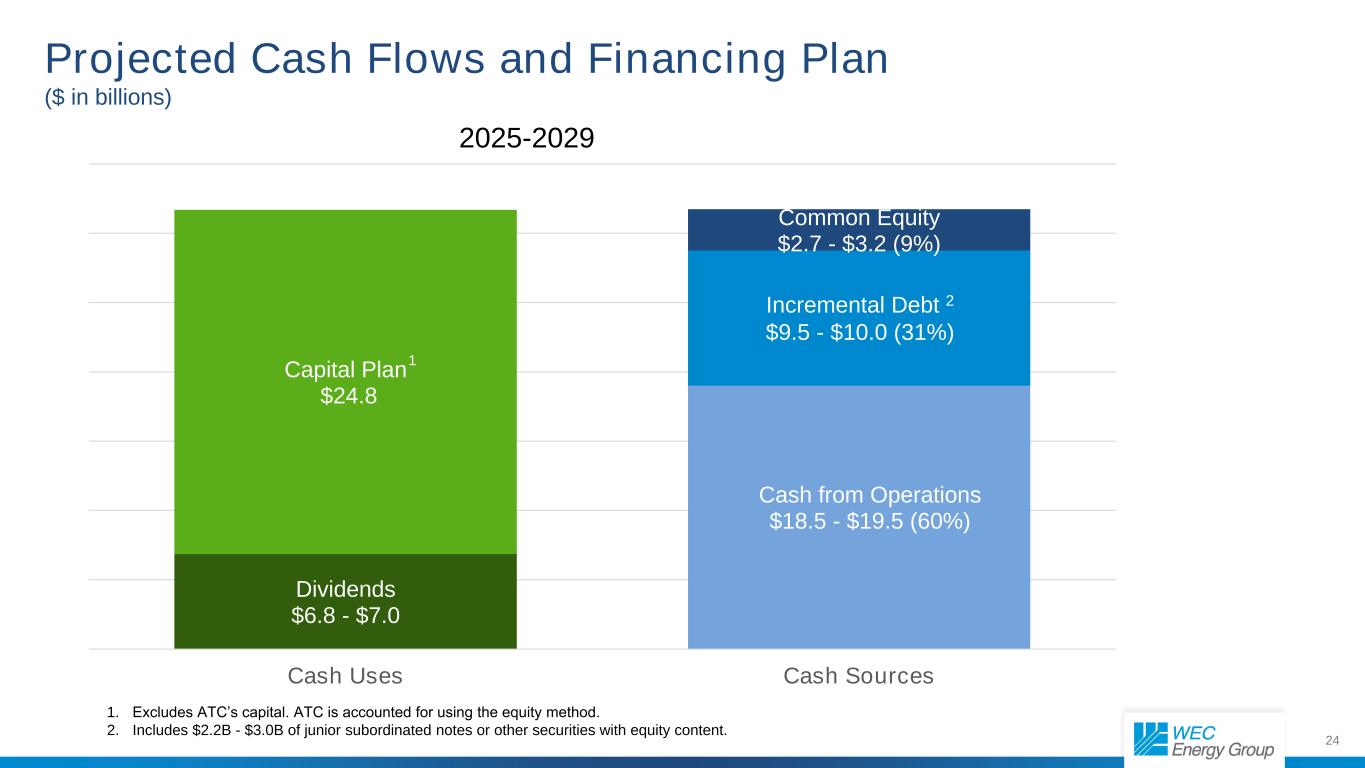 24预计现金流量和融资计划(十亿美元)运营现金18.5美元-19.5美元(60%)普通股2.7美元-3.2美元(9%)股息6.8美元-7.0美元资本计划24.8美元现金使用现金来源增量债务2美元9.5美元-10.0美元(31%)1。不包括ATC的资本。ATC采用权益法核算。2.包括$ 2.2B-$ 3.0B的初级次级票据或其他具有权益内容的证券。2025-2029 1