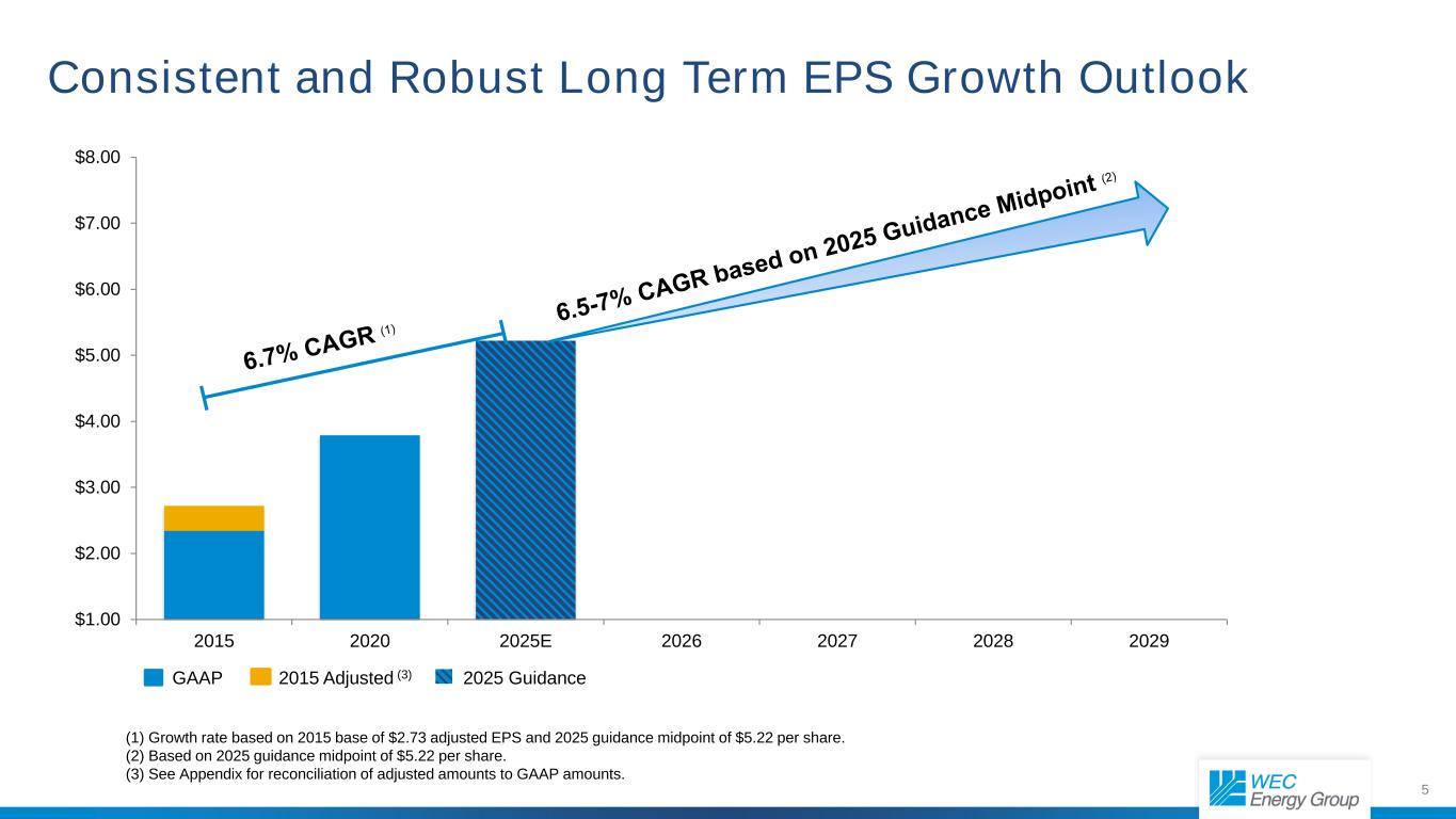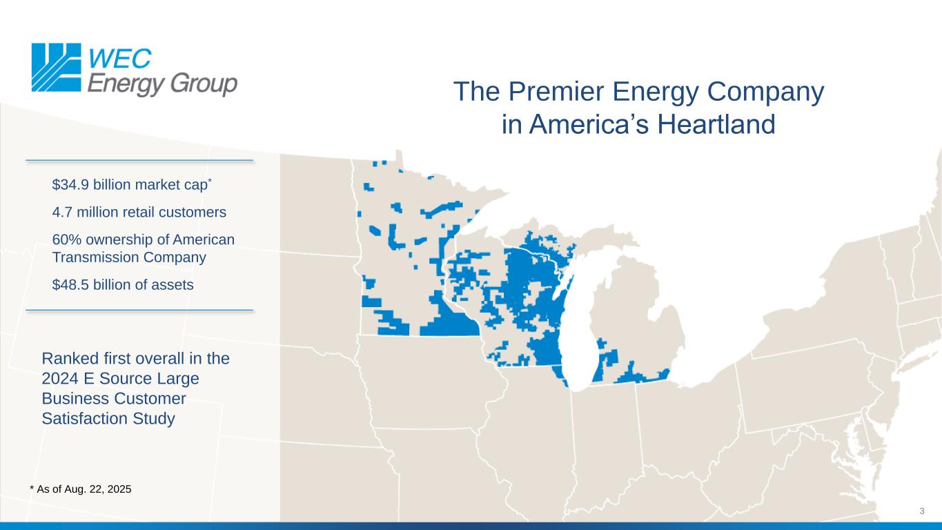 2关于前瞻性信息的警示性声明本演示文稿中包含的大部分信息是基于管理层当前预期和预测的前瞻性信息,其中涉及风险和不确定性。除其他外,前瞻性信息包括有关每股收益、费率案例活动、每股收益增长、现金流、收入来源、股息增长和股息支付率、销量、资本计划、信用评级、信用指标、债务融资、建设成本、投资机会、企业举措(包括ESG进展计划)、费率基数和环境事项(包括减排)的信息。提醒读者不要过分依赖这些前瞻性信息。前瞻性信息并非未来业绩的保证,实际结果可能与前瞻性信息中所述的存在重大差异。可能导致实际结果与任何前瞻性陈述中预期的结果存在重大差异的因素包括但不限于:一般经济状况,包括公司服务领域的业务和竞争条件;费率案件和其他监管决定的时机、解决方案和影响,包括骑手和解;公司继续成功整合其子公司的运营的能力;公司发电设施和/或配电系统的可用性;燃料和购买电力成本的意外变化;关键人员变动;不寻常、变化或恶劣的天气条件;持续的行业重组和整合;持续推进,和采用、产生电力或减少电力消耗的新技术;能源和环境保护努力;电气化倡议、授权和其他减少天然气使用的努力;公司成功获得和/或处置资产和项目以及执行其资本计划的能力;恐怖分子,物理或网络安全威胁或攻击以及数据安全漏洞;建筑风险;劳工中断;股票和债券市场波动;公司及其子公司进入资本市场的能力发生变化;税收立法或我们使用某些税收优惠和结转的能力发生变化;联邦、州和地方立法和法规的变化和不确定性,包括现任美国总统政府导致的利率制定政策或程序和环境标准的变化,在这些法律法规的执行以及监管机构对法规或许可条件的解释方面;供应链中断;通货膨胀;政治或地缘政治发展,包括对全球经济、供应链和燃料价格的影响,一般来说,包括由于美国和外国政府贸易政策的变化,或由于持续、升级或扩大的区域或国际冲突;任何健康危机的影响,包括流行病和流行病;当前和未来的诉讼和监管调查、诉讼或调查;公司成功和/或及时采用新技术的能力,包括人工智能;会计准则变更;美国传动公司的财务业绩以及该公司能源基础设施业务所投资的项目;该公司以具有竞争力的价格获得额外发电量的能力;商誉及其可能的减值;以及管理层对财务状况和经营业绩的讨论和分析中“影响业绩、流动性和资本资源的因素”标题下以及“关于前瞻性信息的警示性声明”和“风险因素”标题下描述的其他因素,这些因素包含在截至2024年12月31日止年度的WEC能源集团的10-K表格中,以及随后提交给美国证券交易委员会的报告。除法律要求外,WEC能源集团明确表示不承担任何公开更新或修改任何前瞻性信息的义务。