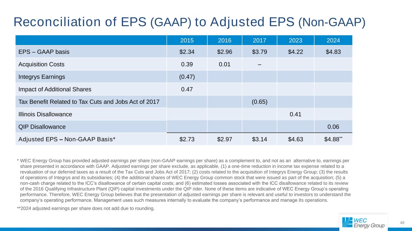 48 EPS(GAAP)与调整后EPS(Non-GAAP)的对账20152016201720232024 EPS – GAAP基础$ 2.34 $ 2.96 $ 3.79 $ 4.22 $ 4.83收购成本0.39 0.01 – Integrys收益(0.47)额外股份的影响0.47与2017年减税和就业法案相关的税收优惠(0.65)伊利诺伊州不允许0.41 QIP不允许0.06调整后EPS –非GAAP基础*$2.73 $2.97 $3.14 $4.63 $4.88***WEC能源集团提供了调整后的每股收益(非公认会计原则每股收益),作为对根据公认会计原则呈报的每股收益的补充,而不是替代。调整后每股收益(如适用)不包括(1)由于2017年《减税和就业法案》而导致的与我们的递延税款重估相关的所得税费用的一次性减少;(2)与收购英迪斯能源集团相关的成本;(3)Integrys及其子公司的经营业绩;(4)增加的WEC能源集团普通股股份作为收购的一部分发行的;(5)与ICC不允许某些资本成本相关的非现金费用;(6)与ICC不允许相关的估计损失与其审查QIP附加条款下的2016年合格基础设施工厂(QIP)资本投资有关。这些项目均不能对WEC能源集团的经营业绩产生指示作用。因此,WEC能源集团认为,调整后每股收益的列报对于投资者了解公司的经营业绩具有相关性和实用性。管理层在内部使用这些措施来评估公司的业绩并管理其运营。**由于四舍五入,2024调整后每股收益不相加。