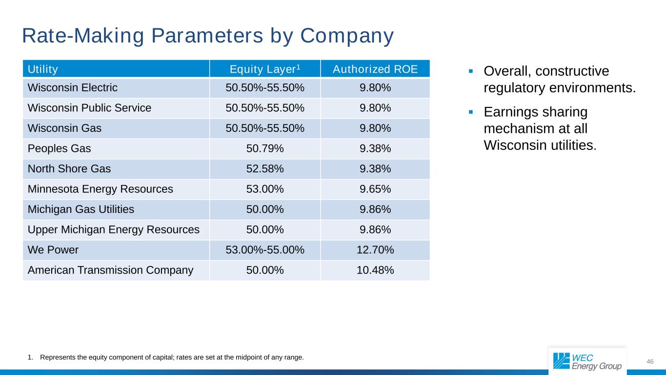46个按公司公用事业股权层划分的费率制定参数1授权ROEWisconsin Electric 50.50%-55.50 % 9.80% Wisconsin Public Service 50.50%-55.50 % 9.80% Wisconsin Gas 50.50%-55.50 % 9.80% Peoples Gas 50.79% 9.38% North Shore Gas 52.58% 9.38% Minnesota Energy Resources 53.00% 9.65% Michigan Gas Utilities 50.00% 9.86% Upper Michigan Energy Resources 50.00% 9.86% WE Power 53.00%-55.00 % 12.70% American Transmission Company 50.00% 10.48% 1。表示资本的权益部分;费率设定在任何范围的中点。总体而言,建设性的监管环境。威斯康星州所有公用事业公司的收益分享机制。