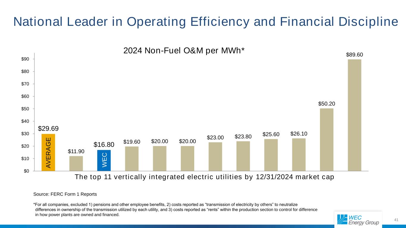 41运营效率和财务纪律方面的国家领导者$ 29.69 $ 11.90 $ 16.80 $ 19.60 $ 20.00 $ 20.00 $ 23.00 $ 23.80 $ 25.60 $ 26.10 $ 50.20 $ 89.60 $ 0 $ 10 $ 20 $ 30 $ 40 $ 50 $ 60 $ 60 $ 70 $ 80 $ 90 2024每兆瓦时非燃料运维*资料来源:FERC Form 1报告*对于所有公司,不包括1)养老金和其他员工福利,2)报告为“他人输电”的成本,以抵消每个公用事业公司使用的输电的所有权差异,以及3)在生产部分内报告为“租金”的成本,以控制电厂拥有和融资方式的差异。12/31/2024前11大垂直综合电力公司市值W E C A V E R A G E