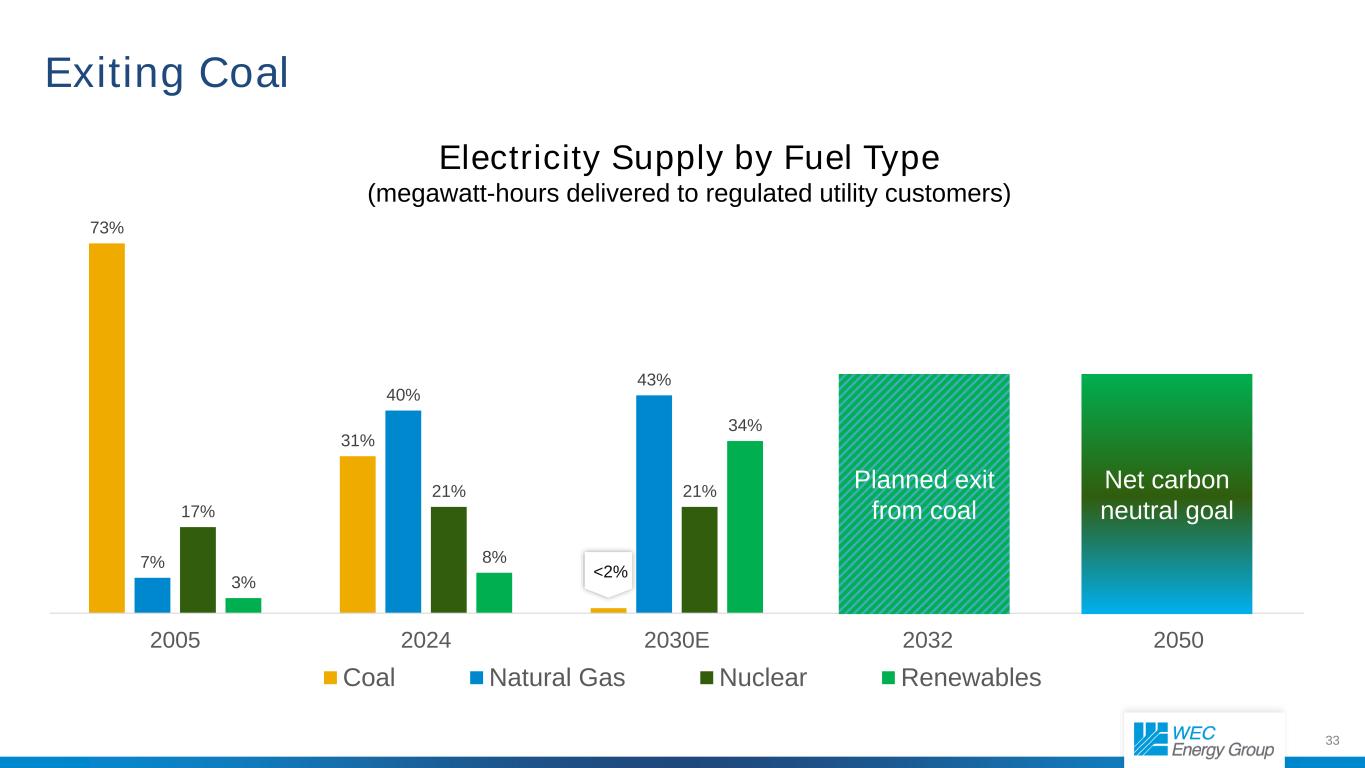 3373% 31% 7% 40% 43% 17% 21% 21% 21% 3% 8% 34% 20052024 2030E 20322050煤天然气核能可再生能源< 2%净碳中和目标按燃料类型计划退出煤炭退出煤电供应(交付给受监管公用事业客户的兆瓦时)