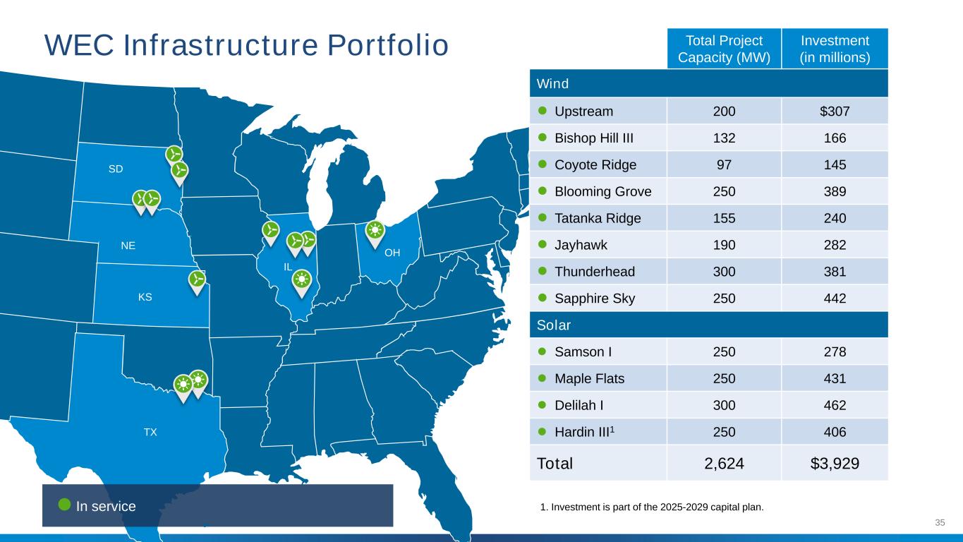 35在役1。投资是2025-2029年资本计划的一部分。项目总容量(MW)投资(百万)风力●上游200 $ 307 ● Bishop Hill III 132166 ● Coyote Ridge 97 145 ● Blooming Grove 250389 ● Tatanka Ridge 155240 ● Jayhawk 190282 ● Thunderhead 300381 ● Sapphire Sky 250442 Solar ● Samson I 250278 ● Maple Flats 250431 ● Delilah I 300462 ● Hardin II1 250406总计2,624 $ 3,929 SD IL NE KS TX OH WEC基础设施投资组合