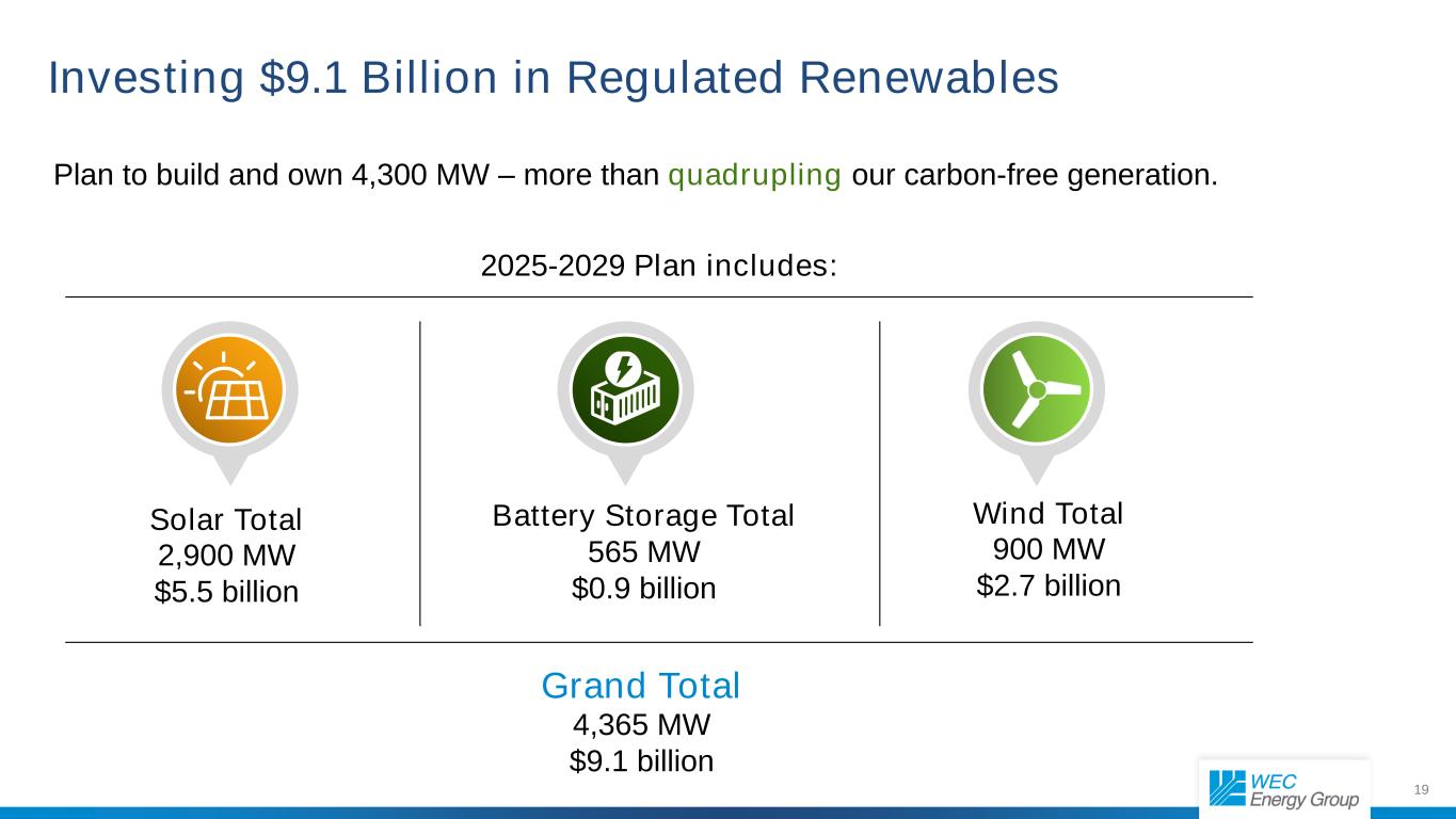 19太阳能总计2,900兆瓦55亿美元电池存储总计565兆瓦9亿美元风能总计900兆瓦27亿美元总计4,365兆瓦91亿美元2025-2029年计划包括:计划建造和拥有4,300兆瓦——将我们的无碳发电量增加四倍以上。向受监管的可再生能源投资91亿美元