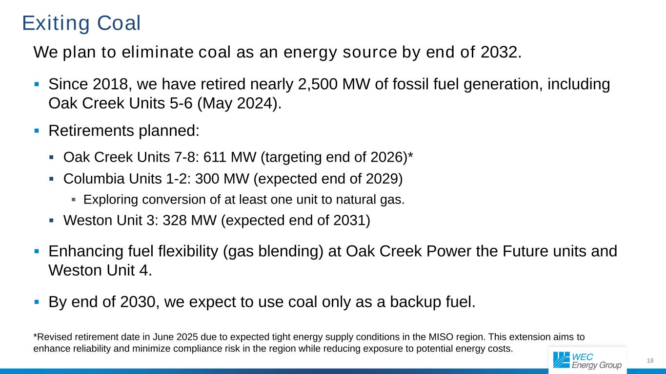 17多元化业务组合63% 16% 4% 7% 10% WI IL MI/MN WECI ATC*按业务管辖49% 32% 2% 7% 10%发电及配电天然气分销LNG(配电及发电)WECI电力传输*基于平均资产基础。*ATC采用权益法核算;这代表了WEC能源集团在资产基础中所占的部分。57% 24% 4% 5% 10% 71% 10% 4% 5% 10% 2029年资产基础488亿美元2024年资产基础308亿美元9.6% CAGR