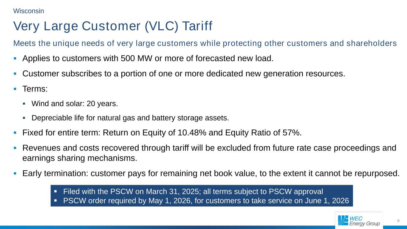 9威斯康星州甚大客户(VLC)关税满足甚大客户的独特需求,同时保护其他客户和股东适用于预测新增负荷为500兆瓦或更多的客户。客户订阅一个或多个专用新一代资源的一部分。条款:风能和太阳能:20年。天然气和电池存储资产的折旧年限。整期固定:股本回报率为10.48%,股本比率为57%。通过关税收回的收入和成本将被排除在未来的费率案件诉讼和收益分享机制之外。提前终止:客户支付剩余的账面净值,在无法重新利用的范围内。于2025年3月31日在PSCW备案;所有条款均以2026年5月1日之前客户在2026年6月1日之前接受服务所需的PSCW批准PSCW订单为准