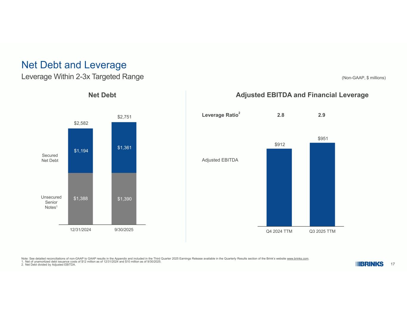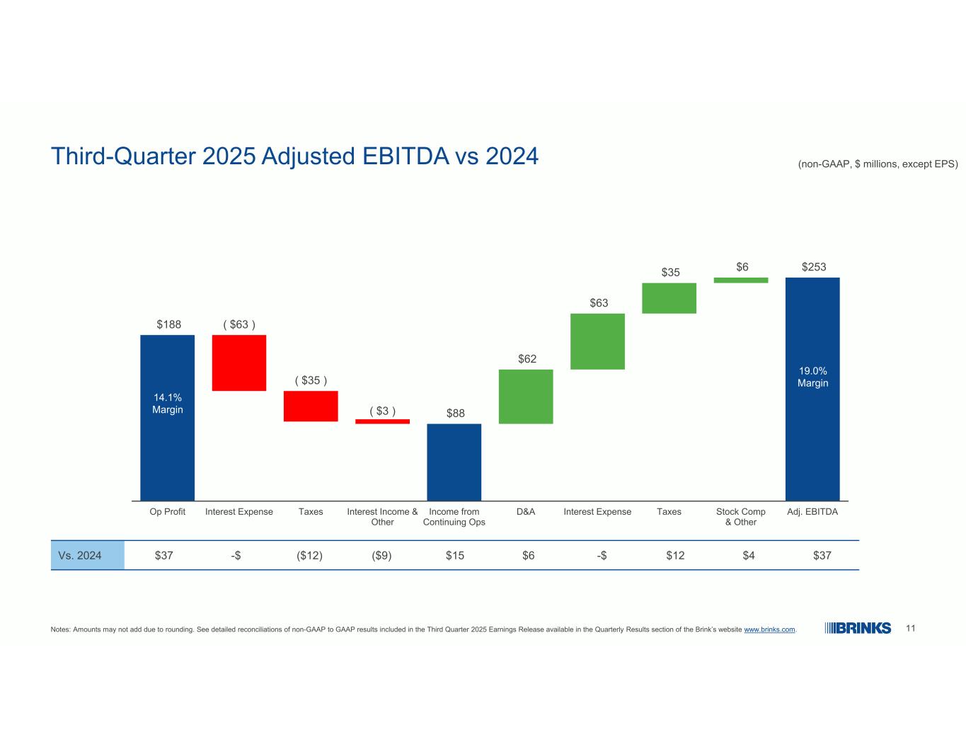 11 $ 188($ 63)($ 35)($ 3)$ 88 $ 62 $ 63 $ 35 $ 6 $ 253 OP利润利息费用税利息收入和其他收入来自持续的OPS D & A利息费用税股票补偿和其他调整后EBITDA 2025年第三季度调整后EBITDA与2024年(非美国通用会计准则,百万美元,EPS除外)19.0%利润率14.1%利润率注:由于四舍五入,金额可能不会相加。请参阅Brink网站www.brinks.com的季度业绩部分提供的2025年第三季度收益发布中包含的非GAAP与GAAP结果的详细对账。$ 37 $ 4 $ 12-$ 6 $ 15($ 9)($ 12)-$ 37vs。2024