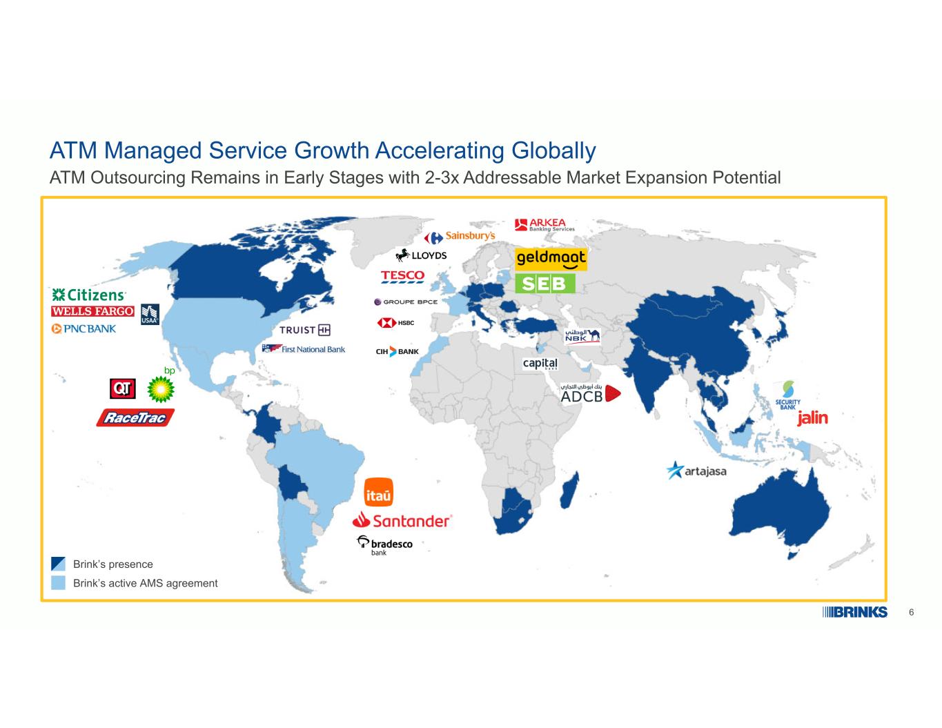 6全球范围内ATM托管服务增长加速ATM外包仍处于早期阶段,具有2-3倍的可寻址市场扩张潜力Brink的存在Brink的活跃AMS协议
