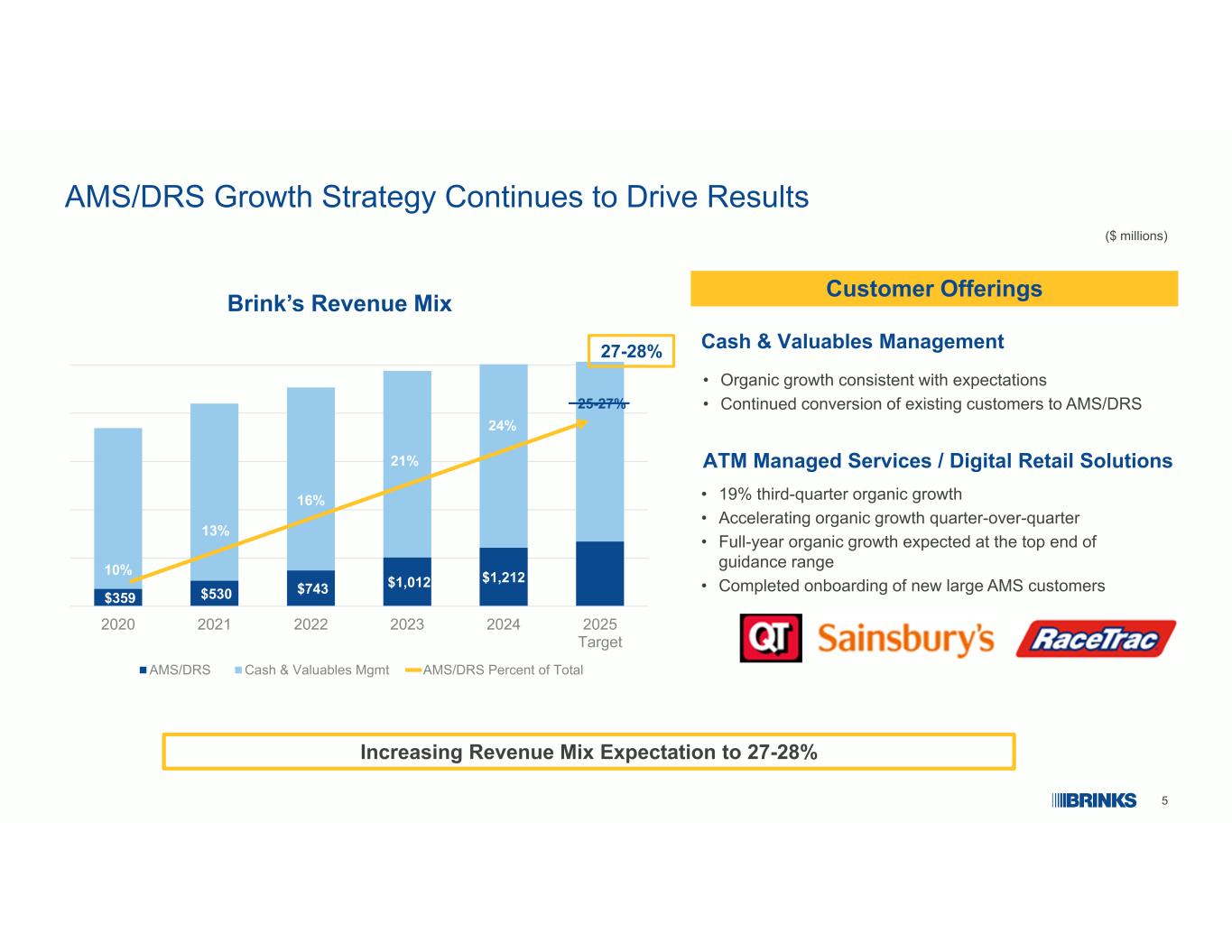4执行与我们的价值创造战略有机增长01扩大利润率02提高FCF转换03最大化股东价值045%年初至今有机增长18%年初至今AMS/DRS有机增长创纪录的EBITDA利润率在北美/欧洲下半年加速扩张利润率增长78%至自由现金流年初至今营运资本改善资本支出效率年初至今利用1.54亿美元以每股89.05美元的价格回购了170万股On Track 50% + FCF回报股东4注:请参阅Brink网站www.brinks.com的业绩部分中提供的2025年第三季度收益发布中包含的非GAAP与GAAP业绩的详细对账。请参阅附录中非GAAP与GAAP 2023年第三季度业绩的详细对账。不变货币代表以2024年汇率计算的2025年业绩。
