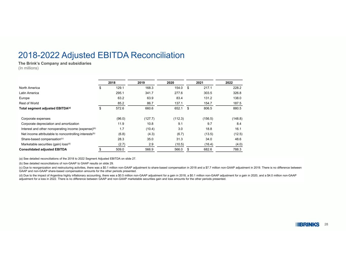 27 2018-2022 Non-GAAP调节–分部调整后EBITDA The Brink’s Company and Subsidiaries(百万)20222021202020192018分部调整后EBITDA:全年、全年、全年、全年分部调整后EBITDA加回:折旧和摊销GAAP金额分部调整后EBITDA加回:折旧和摊销GAAP金额分部调整后EBITDA加回:折旧和摊销GAAP金额分部调整后EBITDA加回:折旧和摊销GAAP金额分部调整后EBITDA加回:折旧和摊销GAAP金额营业利润:228.269.1 $ 159.12 17.168.7 $ 148.41 54.06 2.3 $ 91.71 68.36 4.2 $ 104.11 29.158.2 $ 70.9北美326.84 9.1277.7 303.5 46.2257.3 277.64 4.02 33.63 41.74 4.82 96.92 95.14 0.2254.9拉丁美洲138.03 9.6 98.41 31.24 1.489.88 3.43 2.25 1.26 3.92 1.34 2.66 3.22 0.24 3.0欧洲187.52 3.6163.91 54.72 3.21 31.5 137.12 0.01 17.186.71 1.075.7 85.21 1.17 4.1世界其他地区88 0.5 181.46 99.1806.5179.56 27.06 52.1158.5493.66 60.61 41.35 19.3572.61 29.74 42.9总分部8.4(