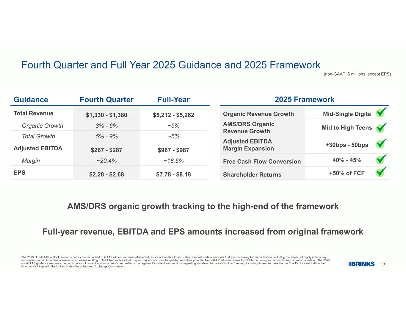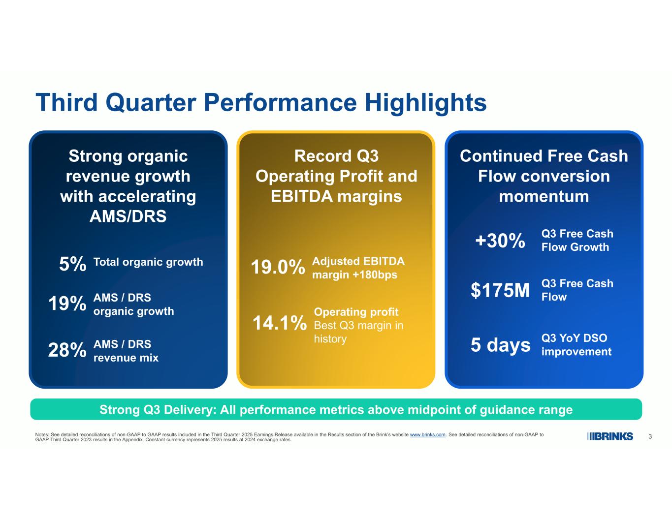 2前瞻性陈述和非公认会计原则结果这些材料包含前瞻性信息。“预期”、“假设”、“估计”、“预期”、“目标”、“项目”、“模型”、“预测”、“打算”、“计划”、“相信”、“潜力”、“可能”、“应该”等词语和类似表述可能会识别前瞻性信息。这些材料中的前瞻性信息包括但不限于:2025年第四季度展望,包括收入、调整后EBITDA、调整后EBITDA利润率和每股收益及其驱动因素;2025年全年指导框架,包括有机收入增长、数字零售解决方案(“DRS”)和ATM托管服务(“AMS”)有机收入增长、调整后EBITDA利润率扩张、自由现金流转换和股东回报及其驱动因素;资本配置优先事项;美国和全球宏观经济状况的影响;关税和外国通货膨胀的影响;部署技术支持的解决方案的预期影响,包括AMS和DRS;未决法律事务的影响,包括智利反垄断事务;阿根廷经营环境的影响;战略优先事项和举措,包括The Brink的业务系统以及技术和系统投资。本文件中的前瞻性信息受已知和未知风险、不确定性和意外事件的影响,这些风险、不确定性和意外事件难以预测或量化,可能导致实际结果、业绩或成就与预期存在重大差异。这些风险、不确定性和突发事件,其中许多是我们无法控制的,包括但不限于:我们提高盈利能力以及在核心业务中执行进一步的成本和运营改进和效率的能力;我们提高核心业务的服务水平和质量的能力;市场波动和商品价格波动;一般经济问题,包括供应链中断、燃料价格上涨、新的或增加的国际关税和/或贸易壁垒、通货膨胀、衰退情况和利率变化;季节性,定价和其他竞争性行业因素;信息技术(“IT”)投资及其对收入和利润增长的影响;与使用人工智能(“AI”)技术相关的风险;我们维持有效IT基础设施和保护与我们的IT系统和网络(包括基于云的应用程序)故障相关的机密信息和风险的能力,以及与当前和新出现的技术威胁相关的风险,以及计算机病毒、未经授权的访问和网络攻击造成的损害,包括越来越复杂的网络攻击,包括使用人工智能和其他类似的干扰;我们为客户有效开发和实施解决方案的能力;与在外国经营相关的风险,包括不断变化的政治、劳工和经济状况(包括政治冲突或动乱)、监管问题(包括实施国际制裁,包括美国政府)、军事冲突(包括但不限于以色列和周边地区的冲突,以及此类冲突可能扩大和潜在的地缘政治后果)、货币限制和贬值、收益和资本汇回的限制和成本,由于司法管辖区的通胀高于预期和那些被确定为高度通胀的国家,以及包括国有化在内的限制性政府行动,对公司财务业绩的影响;劳工问题,包括劳动力短缺、与有组织的劳工谈判和停工;流行病、恐怖主义行为、罢工或其他对全球或区域现金贸易产生负面影响的特殊事件;鉴于我们目前的流动性状况,预期的现金需求;美元相对于外币和外币汇率的强势;我们识别的能力,评估并完成收购和其他战略交易,并成功整合被收购公司;与处置和产品或市场退出相关的成本;我们获得适当保险的能力、保险公司在索赔方面采取的立场以及保险公司的财务状况;安全和安保表现和损失经验;与前煤炭业务相关的员工、环境和其他责任,包括黑肺索赔;《美国救援计划法案》和《患者保护和平价医疗法案》对遗留负债和持续运营的影响;资金要求、会计处理以及我们养老金计划的投资业绩, VEBA和其他员工福利;精算假设中估计负债和资产的变化;对冲关系的性质和交易对手风险;进入资本和信贷市场;我们实现递延所得税资产的能力;外国税收抵免法规的影响;One Big Beautiful Bill法案的影响;未决和未来索赔、诉讼和行政诉讼的结果;我们遵守监管合规义务的能力;公众对我们的业务、声誉和品牌的看法;我们识别的能力,招聘和留住关键员工;我们关键会计政策所依据的估计和假设的变化;以及新会计准则、新政府法规的颁布和采用以及对现有准则和法规的解释。这份风险、不确定性和意外情况清单并非详尽无遗。可能导致我们的结果与前瞻性陈述中描述的结果存在重大差异的其他因素,可以在我们截至2024年12月31日的10-K表格年度报告第1A项的“风险因素”下找到,也可以在我们向美国证券交易委员会提交的其他公开文件中的相关披露中找到。在评估前瞻性陈述时,应考虑本文和其中描述的所有风险因素和不确定性,本文件中的所有前瞻性陈述均受到本文和其中包含或提及的警示性陈述的明确限定。预期的实际结果或发展可能无法实现,或即使实质上实现,也可能不会对公司或我们的业务或运营产生预期的后果或影响。告诫读者不要过分依赖这份文件中包含的前瞻性陈述。本文件中包含的前瞻性信息仅具有截至本文件发布之日的代表性,布林克斯公司不承担更新、修改或澄清本文件中包含的任何信息或可能代表我们不时做出的前瞻性陈述的义务,无论是由于新信息、未来事件或其他原因,除非法律要求。这些材料受版权保护,未经Brink's书面许可,不得使用。今天的演讲主要集中在非公认会计原则的结果上。非GAAP与GAAP结果的详细对账包含在附录中。