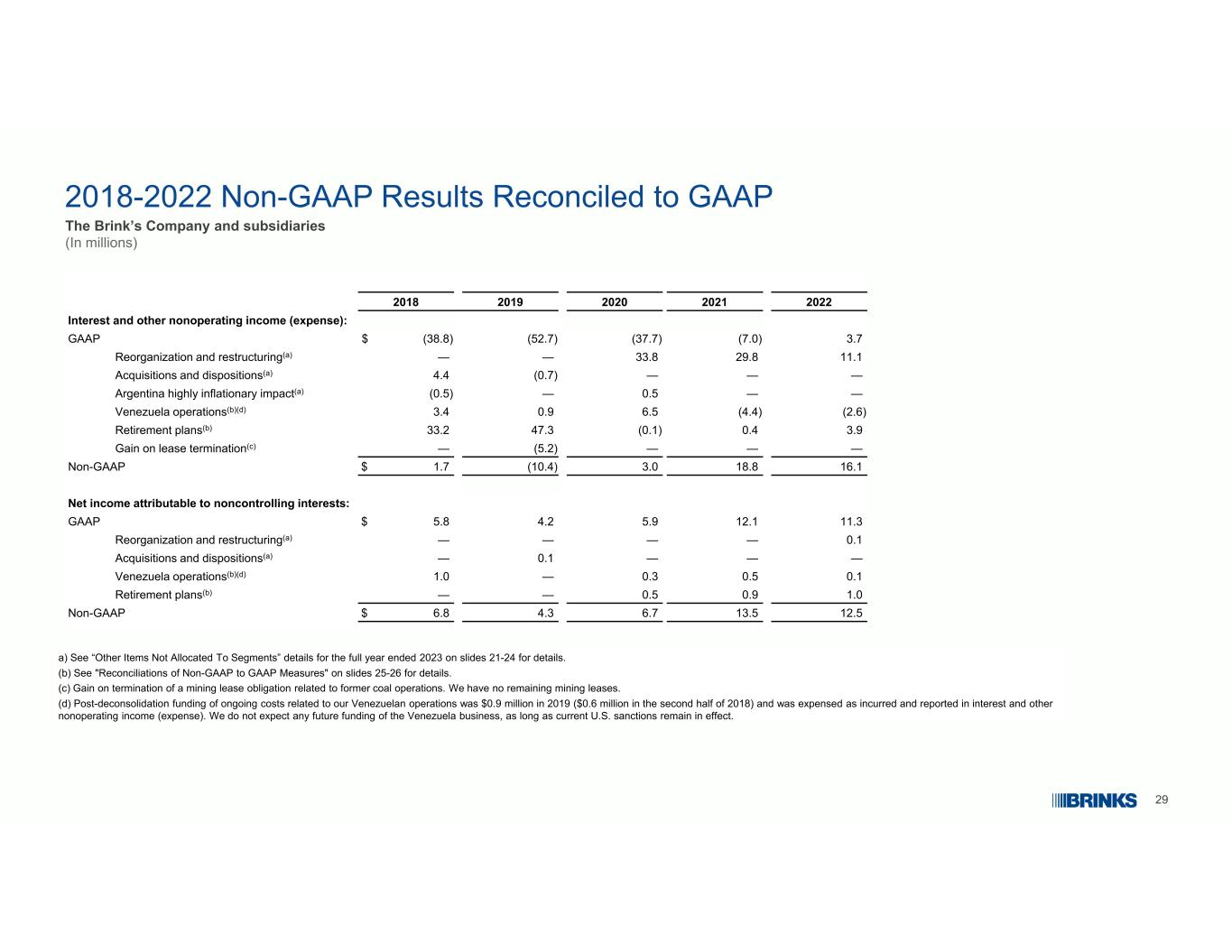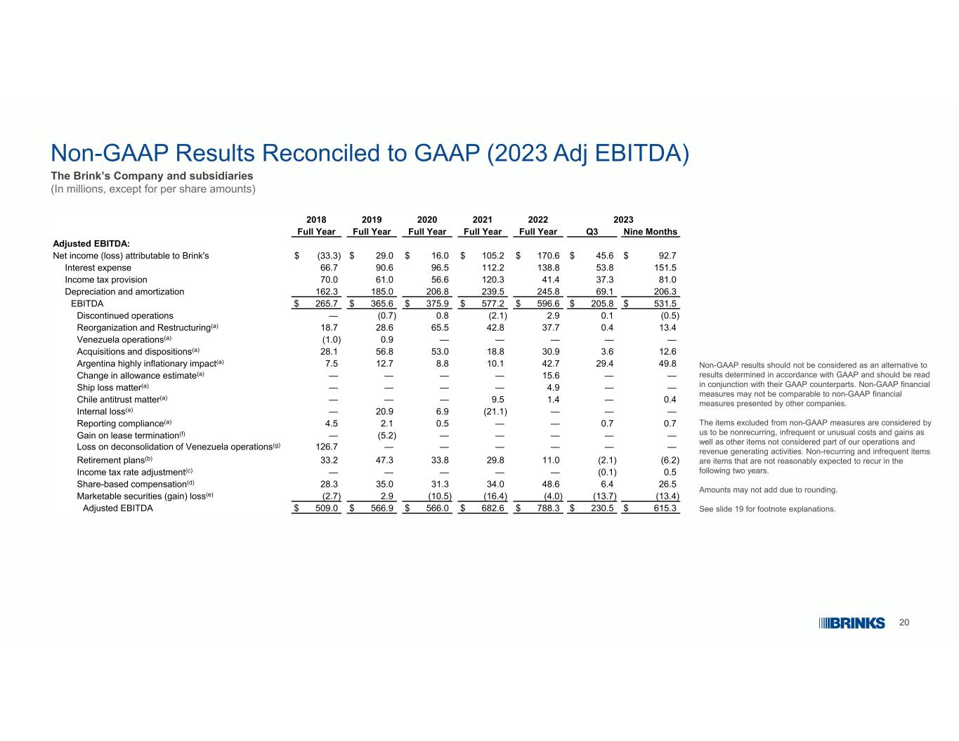25非公认会计原则措施和与公认会计原则措施的对账下文描述并包含在本文件中的非公认会计原则措施是非公认会计原则要求或按照公认会计原则提出的财务措施。披露这些非公认会计原则措施的目的是通过排除某些收入和支出的影响来报告我们业务的主要运营的财务信息,这些收入和支出不反映我们运营的普通收益。这些非公认会计准则财务指标旨在为投资者提供我们在所述期间的经营业绩和趋势的补充比较。我们的管理层认为,这些措施对投资者也很有用,因为这些措施允许投资者使用我们的管理层用来评估过去业绩和未来业绩前景的相同指标来评估我们的业绩。下表中的调节包括我们认为不反映我们经营业绩的调整,因为这些调整是由不属于我们核心业务的事件和情况引起的。此外,某些非GAAP业绩,包括非GAAP营业利润,在某些管理层激励薪酬计划中被用作业绩衡量标准。非GAAP结果不应被视为根据GAAP确定的结果的替代方案,应与GAAP对应结果一起阅读。非GAAP财务指标可能无法与其他公司提出的非GAAP财务指标进行比较。我们认为,非GAAP措施中排除的项目是非经常性、不经常或不寻常的成本和收益,以及不被视为我们运营和创收活动一部分的其他项目。非经常项目和非经常项目是合理预计在以后两年内不会再发生的项目。除了上述理由外,我们认为以下非GAAP指标有助于投资者评估与我们管理层评估业绩的方式一致的经营业绩:非GAAP营业利润和非GAAP营业利润率:非GAAP营业利润等于GAAP营业利润,不包括未分配给分部的其他项目。非美国通用会计准则营业利润率等于非美国通用会计准则营业利润除以收入。•归属于布林克的持续经营业务的非GAAP收入:这一衡量标准等于归属于布林克的持续经营业务的GAAP收入,不包括未分配给分部的其他项目以及某些退休计划费用/收益和递延所得税资产估值备抵的不寻常调整。•利息支出、所得税、折旧和摊销前利润(“EBITDA”)和调整后EBITDA:EBITDA的计算方法是从归属于Brink's的净收入开始,加回利息支出、所得税、折旧和摊销的金额。调整后EBITDA等于EBITDA,不包括未分配给分部的其他项目的适用影响以及某些退休计划费用/收益、递延所得税资产估值津贴的不寻常调整、所得税率调整、基于股份的薪酬和有价证券(收益)损失。•归属于布林克普通股股东的持续经营业务的非公认会计准则稀释每股收益(“EPS”):这一衡量标准等于归属于布林克的持续经营业务的非公认会计准则收入除以稀释后的股份。•收购/处置的影响:这一衡量指标是指在任一可比期间没有报告业绩的整年的收购或处置的影响。•货币效应:这一衡量指标包括高度通胀核算下阿根廷贬值的影响和每月货币变化的总和。每月货币变动是指与上年同期相比,外币汇率变动对当期结果的影响在全年的累积。• Non-GAAP税前收入、Non-GAAP所得税和Non-GAAP有效所得税率:Non-GAAP税前收入和Non-GAAP所得税相等,不包括未分配给分部的其他项目的适用影响以及某些退休计划费用/收益和递延所得税资产估值备抵的不寻常调整。非美国通用会计准则有效所得税率等于非美国通用会计准则所得税除以非美国通用会计准则税前收入。•