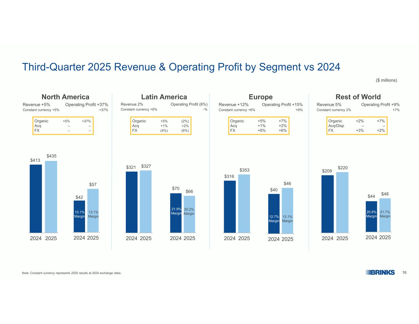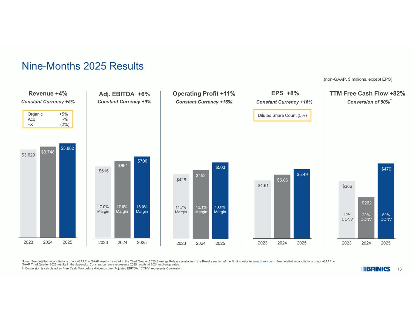 182025年9个月业绩(非GAAP,百万美元,EPS除外)注:请参阅Brink网站www.brinks.com的业绩部分提供的2025年第三季度收益发布中包含的非GAAP与GAAP业绩的详细对账。请参阅附录中非GAAP与GAAP 2023年第三季度业绩的详细对账。不变货币代表以2024年汇率计算的2025年业绩。1.转换计算为股息前的自由现金流超过调整后的EBITDA。“CONV”代表转换。收入+ 4%有机+ 5% ACQ-%外汇(2%)调整后EBITDA + 6% $ 3,629 $ 3,748 $ 3,882 202320242025固定货币+ 5%固定货币+ 9% EPS + 8%固定货币+ 16% $ 4.61 $ 5.06 $ 5.49 202320242025 $ 615 $ 661 $ 70020232024202518.0% Margin 17.6% Margin 17.0% Margin $ 426 $ 452 $ 503202320242025 Operating Profit + 11% Constant Currency + 16% 11.7% Margin 12.1% Margin 13.0% Margin Diluted Shares Count(5%)TTM自由现金流+82%转换50% 1 $ 366 $ 262 $ 47620232024202550% CONV 29% CONV 42% CONV