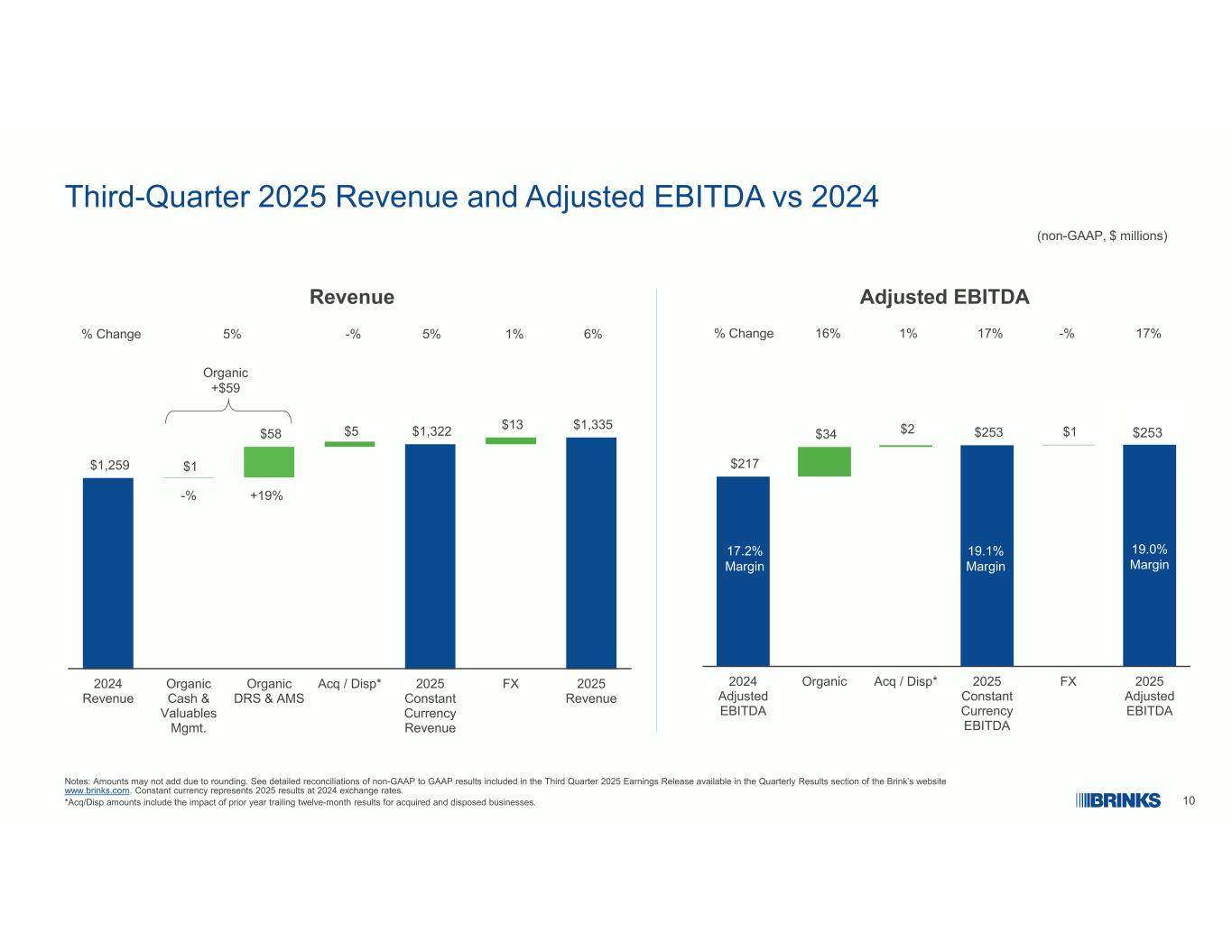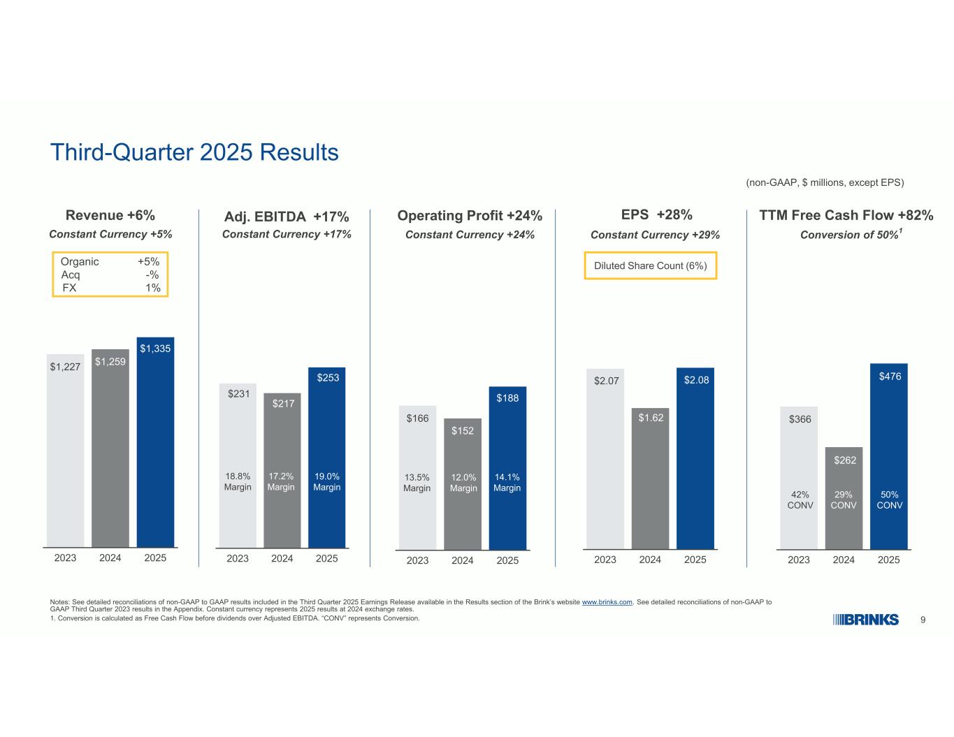92025年第三季度业绩(非GAAP,百万美元,EPS除外)注:请参阅Brink网站www.brinks.com的业绩部分提供的2025年第三季度收益发布中包含的非GAAP与GAAP业绩的详细对账。请参阅附录中非GAAP与GAAP 2023年第三季度业绩的详细对账。不变货币代表以2024年汇率计算的2025年业绩。1.转换的计算方法是股息前的自由现金流超过调整后的EBITDA。“CONV”代表转换。收入+ 6%有机+ 5% ACQ-% FX 1% Adj. EBITDA + 17% $ 1,227 $ 1,259 $ 1,335202320242025固定货币+ 5%固定货币+ 17% EPS + 28%固定货币+ 29% $ 2.07 $ 1.62 $ 2.08 202320242025 $ 231 $ 217 $ 25320232024202519.0% Margin17.2 % Margin18.8 % Margin18.8 % Margin18.8 % Margin18.8 % Margin1 $ 366 $ 262 $ 47620232024202550% CONV 29% CONV 42% CONV $ 166 $ 152 $ 188202320242025 Operating Profit + 24% Constant Currency + 24% 13.5% Margin12.0 Margin14.1 MarginDiluted Shares Count(6%)