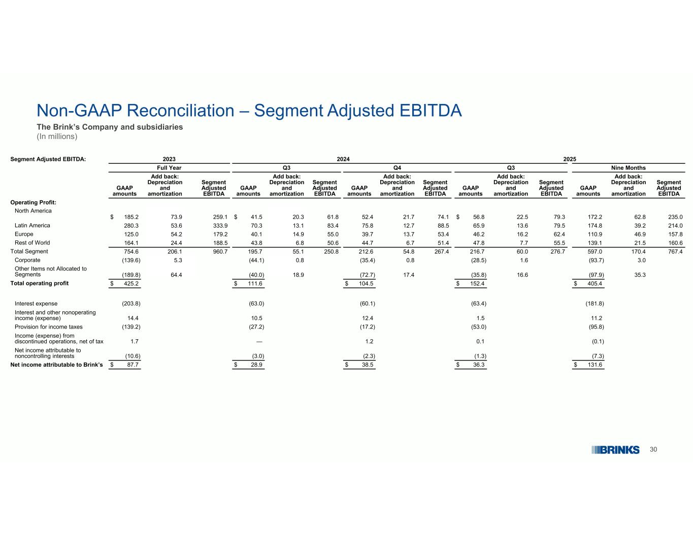 30非GAAP调节–分部调整后EBITDA The Brink’s Company和子公司(百万)202520242023分部调整后EBITDA:九个月Q3Q4Q3全年分部调整后EBITDA加回:折旧和摊销GAAP金额分部调整后EBITDA加回:折旧和摊销GAAP金额分部调整后EBITDA加回:折旧和摊销GAAP金额分部调整后EBITDA加回:折旧和摊销GAAP金额分部调整后EBITDA加回:折旧和摊销GAAP金额分部调整后EBITDA加回:折旧和摊销GAAP金额营业利润:235.06 2.81 72.27 9.32 2.5美元56.87 4.12 1.75 2.46 1.82 0.3美元41.5 259.17 3.9美元185.2美元北美214.03 9.21 74.87 9.51 3.66 5.98 8.51 2.775.88 3.41 3.17 0.33 33.95 3.62 80.3拉丁美洲157.846.91 10.96 2.4 16.246.25 3.41 3.73 9.755.01 4.94 0.1179.25 4.21 25.0欧洲160.62 1.5 139.155.57.74 7.85 1.46.74 4.75 0.66.84 3.8188.5 24.41 64.1世界其他地区767.41 70.4597.02 76.76 0.02 16.72 67.45 4.82 12.62 50.85 5.1 195.79 60.72 06.17 54.6总分部3.0(93.7)1.6(28.5)0.8(35.4)0.8(44.4)0.8(44.4)
