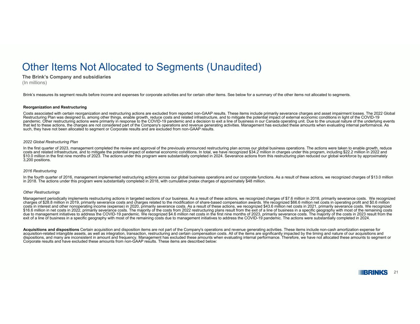 21未分配给分部的其他项目(未经审计)The Brink’s Company and Subsidiaries(in millions)Brink’s measures its segment results before income and expenses for corporate activities and for certain other items。有关未分配给分部的其他项目的摘要,请参见下文。与某些重组和重组行动相关的重组和重组成本不包括在报告的非公认会计原则结果中。这些项目主要包括遣散费和资产减值损失。2022年全球重组计划旨在除其他外促进增长、降低成本和相关基础设施,并根据新冠肺炎大流行减轻外部经济状况的潜在影响。其他重组行动主要是为了应对新冠肺炎大流行,以及决定退出我们加拿大运营部门的一条业务线。由于导致这些行动的潜在事件的不同寻常性质,这些费用不被视为公司运营和创收活动的一部分。管理层在评估内部绩效时已将这些金额排除在外。因此,它们没有被分配到分部或公司业绩中,并且被排除在非公认会计原则业绩之外。2022全球重组计划在2023年第一季度,管理层完成了对先前宣布的重组计划的审查和批准,贯穿我们的全球业务运营。采取这些行动是为了促进增长、降低成本和相关基础设施,以及减轻外部经济状况的潜在影响。我们在该计划下总共确认了3420万美元的费用,其中包括2022年的2220万美元和2023年前九个月的1000万美元。该计划下的行动已于2024年基本完成。这项重组计划的遣散行动使我们的全球员工减少了大约3200个职位。2016年重组在2016年第四季度,管理层在我们的全球业务运营和公司职能中实施了重组行动。由于这些行动,我们在2018年确认了1300万美元的费用。该计划下的行动在2018年基本完成,累计税前费用约为4800万美元。其他重组管理层定期在我们业务的目标部门实施重组行动。由于这些行动,我们在2018年确认了760万美元的费用,主要是遣散费。我们在2019年确认了2880万美元的费用,主要是遣散费和与修改基于股份的薪酬奖励相关的费用。我们在2020年确认了6660万美元的营业利润净成本和60万美元的利息和其他营业外收入(费用)成本,主要是遣散费。由于这些行动,我们在2021年确认了4360万美元的净成本,主要是遣散费。我们在2022年确认了1660万美元的净成本,主要是遣散费。2022年重组计划产生的大部分成本来自于特定地理区域的一条业务线的退出,其余大部分成本则是由于管理部门为应对新冠肺炎大流行而采取的举措。我们在2023年前九个月确认了460万美元的净成本,主要是遣散费。2023年的大部分成本来自于特定地区的一条业务线的退出,其余的大部分成本则是由于应对新冠肺炎大流行的管理举措。这些行动在2024年基本完成。收购和处置某些收购和处置项目不属于公司运营和创收活动的一部分。这些项目包括与收购相关的无形资产的非现金摊销费用,以及整合、交易、重组和一定的补偿费用。所有项目都受到我们收购和处置的时间和性质的显着影响,许多项目在金额和频率上不一致。管理层在评估内部绩效时已将这些金额排除在外。因此,我们没有将这些金额分配给分部或公司业绩,并将这些金额从非公认会计原则业绩中排除。这些项目描述如下:
