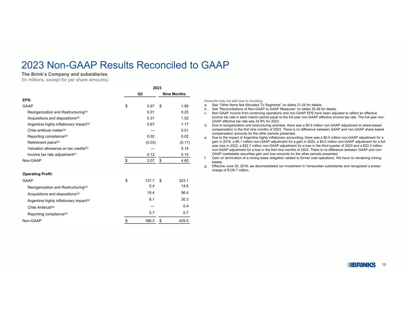 192023年非GAAP业绩与GAAP一致The Brink的公司和子公司(以百万计,每股金额除外)的金额可能不会因四舍五入而相加。a.详见幻灯片21-24上的“未分配给分部的其他项目”。b.详见幻灯片25-26上的“非GAAP与GAAP措施的对账”。c.来自持续经营业务的非GAAP收入和非GAAP每股收益已调整,以反映每个中期期间的有效所得税率等于全年非GAAP有效所得税率。2023年全年非美国通用会计准则有效税率为24.8%。d.由于重组和重组活动,2023年前9个月对基于股份的薪酬进行了90万美元的非美国通用会计准则调整。美国通用会计准则下和非美国通用会计准则下的股权报酬金额在列报的其他期间没有差异。e.由于阿根廷高度通货膨胀会计的影响,2018年有50万美元的非美国通用会计准则下的收益调整,2020年有10万美元的非美国通用会计准则下的收益调整,2022年全年亏损有400万美元的非美国通用会计准则下的调整,2023年第三季度亏损有2270万美元的非美国通用会计准则下的调整,2023年前九个月亏损有2330万美元的非美国通用会计准则下的调整。GAAP和Non-GAAP有价证券损益金额在列报的其他期间没有差异。f.终止与前煤炭业务相关的采矿租赁义务的收益。我们没有剩余的采矿租约。g.自2018年6月30日起,我们取消了对委内瑞拉子公司的投资,并确认了1.267亿美元的税前费用。2023九个月Q3每股收益:1.95美元$ 0.97GAAP 0.25 0.01重组和重组(a)1.02 0.31收购和处置(a)1.17 0.67阿根廷高通胀影响(a)0.01 —智利反垄断事项(a)0.02 0.02报告合规性(a)(0.11)(0.03)退休计划(b)0.14 —税收抵免的估值津贴(b)0.15 0.12所得税率调整(c)4.60美元$ 2.07非美国通用会计准则营业利润:323.1美元$ 137.7GAAP 14.6 0.4重组和重组(a)56.4 19.4收购和处置(a)30.38.1阿根廷高通胀影响(a)0.4 —智利反垄断(a)0.7 0.7报告合规性(a)425.5美元166.3美元非美国通用会计准则