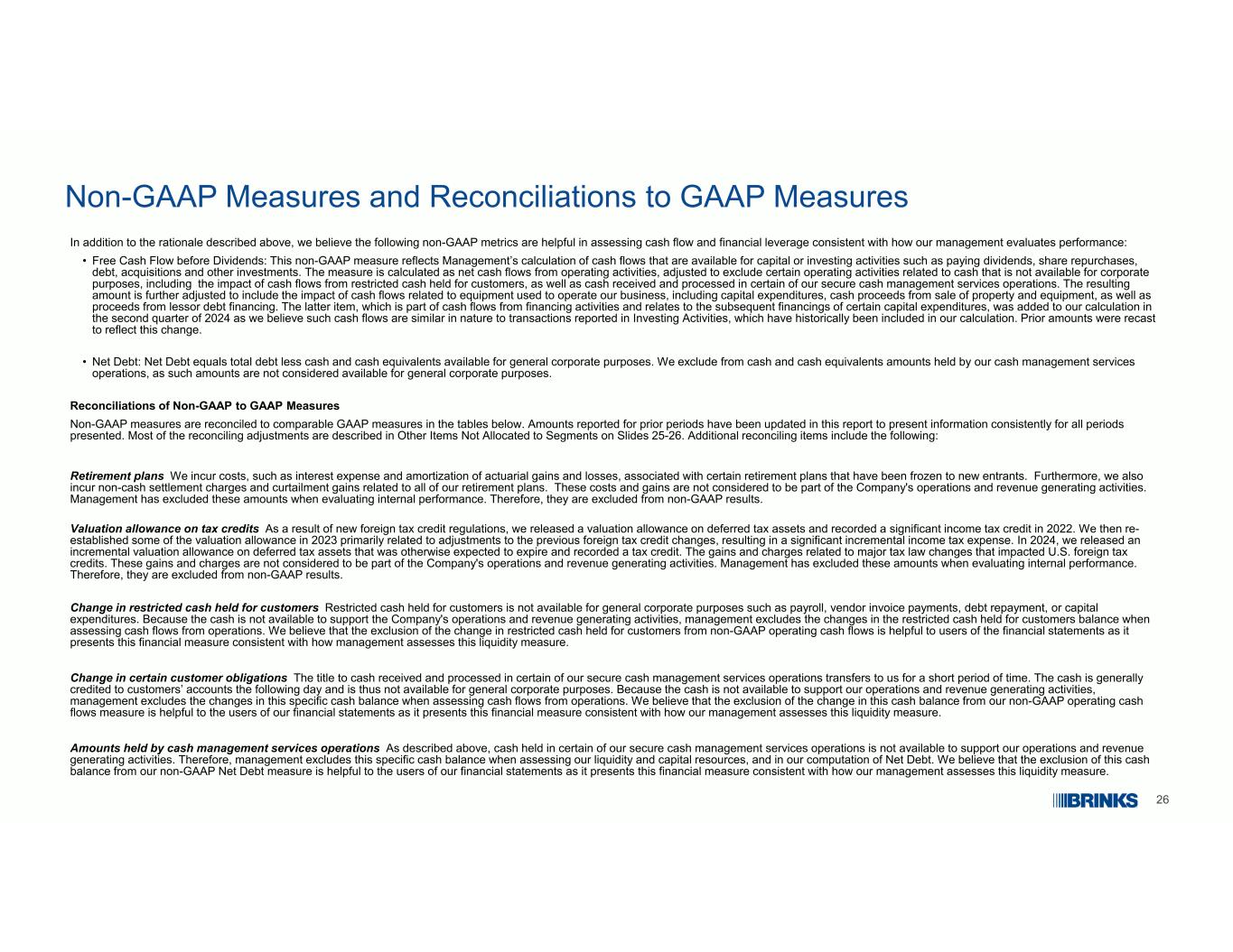 26非公认会计原则措施和与公认会计原则措施的调节除了上述基本原理外,我们认为以下非公认会计原则指标有助于评估与我们管理层评估业绩的方式一致的现金流和财务杠杆:股息前的自由现金流:这一非公认会计原则措施反映了管理层对可用于资本或投资活动(如支付股息、股票回购、债务、收购和其他投资)的现金流的计算。该计量按经营活动产生的现金流量净额计算,经调整以排除与无法用于公司用途的现金相关的某些经营活动,包括为客户持有的受限制现金产生的现金流量的影响,以及在我们的某些安全现金管理服务业务中收到和处理的现金。由此产生的金额进一步调整,以包括与用于经营我们业务的设备相关的现金流的影响,包括资本支出、出售物业和设备的现金收益,以及出租人债务融资的收益。后一项是筹资活动现金流的一部分,与某些资本支出的后续融资有关,在2024年第二季度被添加到我们的计算中,因为我们认为这类现金流在性质上与Investing Activities中报告的交易相似,而这些交易在历史上一直包含在我们的计算中。先前的金额被重新计算以反映这一变化。•净债务:净债务等于总债务减去可用于一般公司用途的现金和现金等价物。我们从现金和现金等价物中排除了我们的现金管理服务业务持有的金额,因为这些金额不被视为可用于一般公司用途。•非公认会计原则与公认会计原则措施的对账非公认会计原则措施与下表中的可比公认会计原则措施进行了对账。本报告对以往各期报告的金额进行了更新,以一致地呈现所有呈报期间的信息。大多数调节调整在幻灯片25-26上未分配给分段的其他项目中进行了描述。额外的调节项目包括:退休计划我们会产生与某些已冻结给新进入者的退休计划相关的成本,例如利息费用和精算损益的摊销。此外,我们还产生与我们所有退休计划相关的非现金结算费用和削减收益。这些成本和收益不被视为公司运营和创收活动的一部分。管理层在评估内部绩效时已将这些金额排除在外。因此,它们被排除在非公认会计原则结果之外。税收抵免的估值减免由于新的外国税收抵免规定,我们发布了递延所得税资产的估值减免,并在2022年录得显着的所得税减免。然后,我们在2023年重新建立了一些估值备抵,主要与对先前外国税收抵免变化的调整有关,导致显着的增量所得税费用。在2024年,我们发布了递延所得税资产的增量估值备抵,否则这些资产预计将到期,并记录了税收抵免。这些收益和收费与影响美国外国税收抵免的重大税法变化有关。这些收益和费用不被视为公司运营和创收活动的一部分。管理层在评估内部绩效时已将这些金额排除在外。因此,它们被排除在非公认会计原则结果之外。为客户持有的受限制现金的变化为客户持有的受限制现金不能用于一般公司用途,例如工资单、供应商发票付款、偿还债务或资本支出。由于现金无法用于支持公司的运营和创收活动,管理层在评估运营现金流时不包括为客户持有的受限现金余额的变化。我们认为,将为客户持有的受限制现金的变化排除在非公认会计准则经营现金流之外,对财务报表的使用者是有帮助的,因为它提出的财务指标与管理层评估这种流动性指标的方式是一致的。某些客户义务的变化在我们的某些安全现金管理服务业务中收到和处理的现金的所有权在短期内转移给我们。现金一般会在第二天打入客户的账户,因此不能用于一般公司用途。因为现金无法用来支持我们的运营和创收活动, 管理层在评估运营现金流时不包括这一特定现金余额的变化。我们认为,将这一现金余额的变化排除在我们的非公认会计准则经营现金流量计量之外,对我们财务报表的使用者是有帮助的,因为它提出的这一财务计量与我们的管理层评估这一流动性计量的方式是一致的。现金管理服务业务持有的金额如上所述,在我们的某些安全现金管理服务业务中持有的现金无法用于支持我们的运营和创收活动。因此,管理层在评估我们的流动性和资本资源时,以及在我们计算净债务时,都将这一特定的现金余额排除在外。我们认为,将这一现金余额排除在我们的非公认会计原则净债务衡量标准之外,对我们财务报表的使用者是有帮助的,因为它提出的这一财务衡量标准与我们的管理层评估这一流动性衡量标准的方式是一致的。