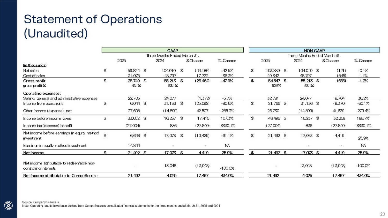 经营报表(未经审计)来源:公司财务注:经营业绩均来自于CompoSecure截至2025年3月31日止三个月的合并财务报表及20242020252024 $变动%变化20252024 $变动%变化(千)净销售额$ 59,824 $ 104,010 $(44,186)-42.5 % $ 103,889 $ 104,010 $(121)-0.1 %销售成本31,07548,79717,722-36.3 % 49,34248,797(545)1.1%毛利$ 28,749 $ 55,213 $(26,464)-47.9 % $ 54,547 $ 55,213 $(666)-1.2 %毛利% 48.1% 53.1% 52.5% 53.1%营业费用:销售,一般及行政开支22,70524,077(1,372)-5.7 % 32,78124,0778,70436.2%营运收入$ 6,044 $ 31,136 $(25,092)-80.6 % $ 21,766 $ 31,136 $(9,370)-30.1 %其他收入(开支),净额27,608(14,899)42,507-285.3 % 26,730(14,899)41,629-279.4 %所得税前收入$ 33,652 $ 16,237 $ 17,415107.3% $ 48,496 $ 16,237 $ 32,259198.7%所得税(费用)福利(27,004)836(27,840)-3330.1 %(27,004)836(27,840)-3330.1 %净收益权益法投资前收益$ 6,648 $ 17,073 $(10,425)-61.1 % $ 21,492 $ 17,073 $ 4,41925.9%权益法投资前收益14,844--NA--NA净收益$ 21,492 $ 17,073 $ 4,41925.9% $ 21,492 $ 17,073 $ 4,41925.9%归属于可赎回非控股权益的净利润-13,048(13,048)-100.0 %-13,048(13,048)-100.0 %归属于CompoSecure的净利润21,4924,02517,467434.0% 21,4924,02517,467434.0% GAAP NON-GAAP截至3月31日的三个月,截至3月31日的三个月,
