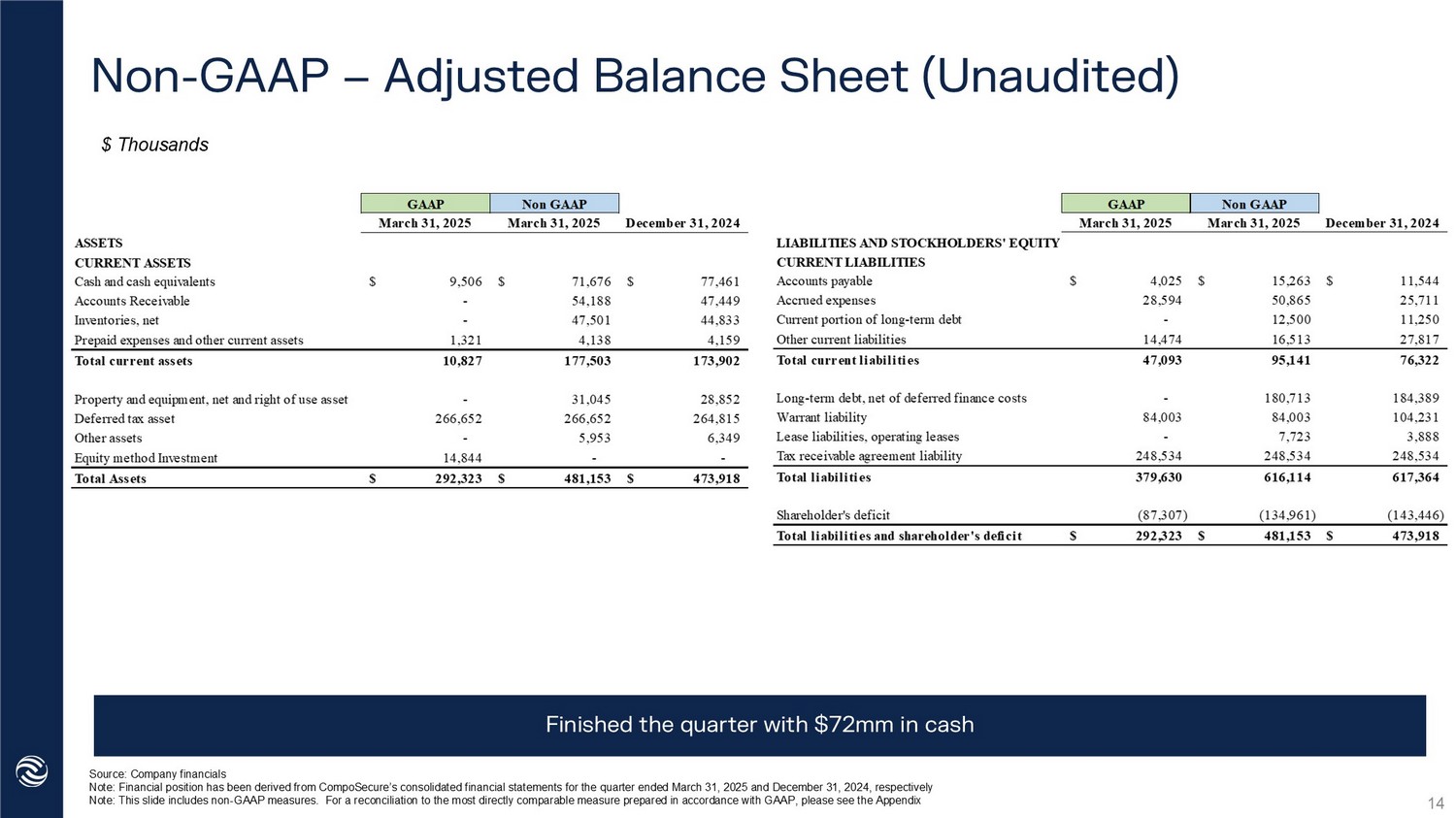 Non-GAAP –调整后资产负债表(未经审计)资料来源:公司财务注:财务状况分别来自CompoSecure截至2025年3月31日和202年12月31日的季度合并财务报表4,注:此幻灯片包含非GAAP衡量标准。有关与根据GAAP编制的最直接可比计量的对账,请参见附录14本季度结束时现金为72毫米$千GAAP Non GAAP 2025年3月31日2025年3月31日2025年12月31日2024年资产流动资产现金和现金等价物9,506美元71,676美元77,461美元应收账款-54,18847,449存货净额-47,50144,833预付费用和其他流动资产1,3214,1384,159流动资产总额10,827177,503173,902财产和设备,净资产和使用权资产-31,04528,852递延所得税资产266,652266,652264,815其他资产-5,9536,349权益法投资14,844--总资产292,323 $ 481,153 $ 473,918 $