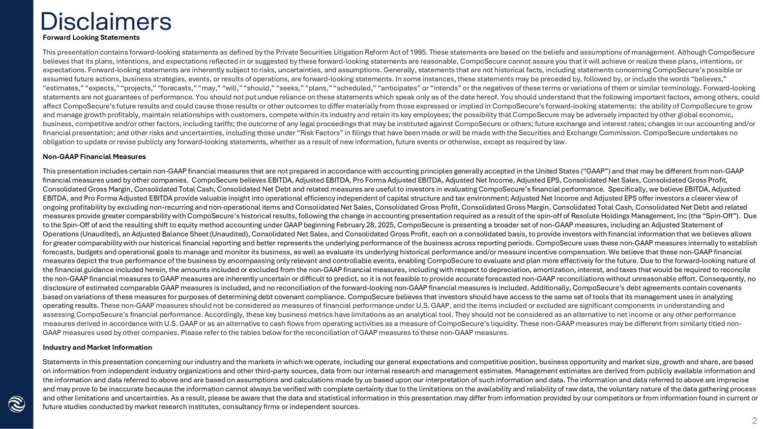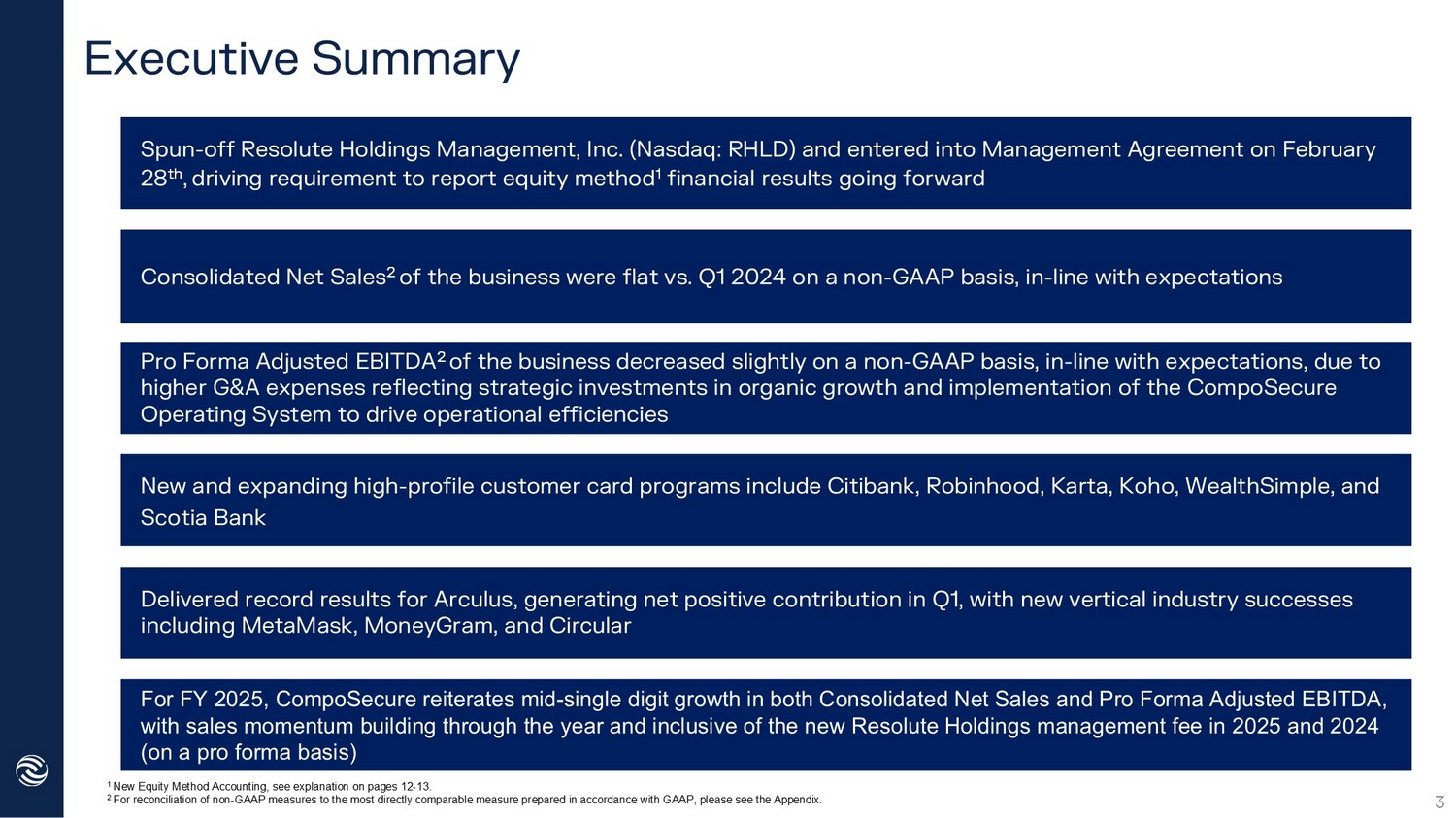 免责声明2前瞻性陈述本演示文稿包含1995年《私人证券诉讼改革法案》所定义的前瞻性陈述。这些陈述是基于管理层的信念和假设。尽管CompoSecure认为这些前瞻性陈述中反映或暗示的其计划、意图和预期是合理的,但是CompoSecure无法向您保证它将实现或实现这些计划、意图或预期。前瞻性陈述本质上受制于风险、不确定性和假设。通常,非历史事实的陈述,包括关于CompoSecure可能的或假设的未来行动、业务战略、事件或运营结果的陈述,均为前瞻性陈述。在某些情况下,这些陈述可能会在前面、后面加上或包含“相信”、“估计”、“预期”、“项目”、“预测”、“可能”、“将”、“应该”、“寻求”、“计划”、“计划”、“预期”或“在十秒内”或这些术语的否定词或它们的变体或类似术语。前瞻性陈述不是业绩的保证。你不应该过分依赖这些声明,这些声明仅在我们吃到这里时才说话。您应该了解,除其他外,以下重要因素可能会影响CompoSecure未来的业绩,并可能导致这些结果或其他结果与CompoSecure前瞻性陈述中明示或暗示的结果或结果存在重大差异:CompoSecure可能受到其他全球经济、商业、竞争和/或其他因素的不利影响,TERM3的能力,包括关税;可能由美国ST CompoSecure或其他机构提起的任何法律诉讼的结果;未来的汇率和利率;我们的会计和/或财务列报方式的变化;以及其他风险和不确定性,包括已经或将向美国证券交易委员会提交的文件中“风险因素”项下的风险和不确定性。除非法律要求,否则CompoSecure不承担因新信息、未来事件或其他原因而公开更新或修改任何前瞻性陈述的义务。非GAAP财务指标本演示文稿包括某些非GAAP财务指标,这些指标不是根据美国公认会计原则(“GAAP”)编制的,可能与其他公司使用的非GAAP财务指标不同。CompoSecure认为,EBITDA、调整后EBITDA、备考调整后EBITDA、调整后D N et收入、调整后每股收益、合并净销售额、合并毛利润、C合并毛利率、合并总现金、合并净债务和相关指标有助于投资者评估Compo SEC ure的财务业绩。具体来说,我们认为EBITDA、调整后EBITDA和备考调整后EBITDA提供了对独立于资本结构和税收环境的运营效率的宝贵见解;调整后的净收益e a和调整后的每股收益通过排除非经常性和非运营项目以及合并净销售额为投资者提供了对持续盈利能力的更清晰的看法,合并毛利润、合并毛利率、合并总现金、合并净债务和相关衡量标准提供了与CompoSecure历史业绩更大的可比性,继因Resolute Holdings Management,Inc分拆(“分拆”)而被重新查询的会计列报方式变更后。由于从2025年2月28日开始分拆并因此转向GAAP下的权益法会计,CompoSecure提出了一套更广泛的非GAAP衡量标准,包括调整后的运营报表(未经审计)、调整后的资产负债表(未经审计)、合并净销售额和合并毛利润,每一项都以合并为基础,以向投资者提供财务信息,我们认为这些信息可以与我们的历史财务报告有更大的可比性,并更好地代表报告期内业务的基本业绩。CompoSecure在实习时使用这些非GAAP衡量标准来建立预测、预算和运营目标,以管理和监控其业务,并评估其基本的历史PE RFO管理和/或衡量激励薪酬。我们认为,这些非GAAP财务指标通过仅包含相关且可控的事件来描述业务的真实表现,使CompoSecure能够更有效地评估和规划未来。由于此处包含的财务指导具有前瞻性,非GAAP财务指标中包含或排除的金额, 包括与折旧、摊销、利息和税收相关的、用于将非公认会计原则财务措施与公认会计原则措施进行核对的R就具有内在的不确定性或难以预测,因此如果不做出不合理的努力,就无法证明准确的预测非公认会计原则调节是不可行的。因此,没有包括估计的可比GAAP措施的披露,也没有包括前瞻性非GAAP财务保证的调节。此外,CompoSecure的债务协议包含基于这些措施的变化的契约,以确定债务契约的合规性。CompoSecure认为,投资者应该可以使用其管理层在分析经营业绩时使用的同一套工具。这些非GAAP衡量标准不应被视为美国GAAP下财务业绩的衡量标准,包含或排除的项目是了解和评估CompoSecure财务业绩的重要组成部分。因此,这些关键业务指标作为分析工具存在局限性。T hey不应被视为根据美国公认会计原则得出的净收入或任何其他业绩衡量标准的替代方案,或作为衡量Compo Secure流动性的经营活动现金流的替代方案。这些非GAAP衡量标准可能与其他公司使用的类似名称的非GAAP衡量标准不同。请参阅下表,了解GAAP措施与这些非-GAA P措施的对账情况。本演示文稿中有关我们的行业和我们经营所在市场的行业和市场信息声明,包括我们的一般预期NS和竞争地位、商业机会和市场规模、增长和份额,均基于来自独立行业组织和其他第三方来源的信息、来自我们内部研究和管理估计的数据。管理层的估计来自公开可用的信息以及上述信息和数据,并且是基于我们根据我们对这些信息和数据的解释做出的假设和计算。上述信息和数据是不精确的,可能被证明是不准确的,因为由于原始数据的可用性和可靠性的局限性、数据收集过程的自愿性以及其他限制和不确定性,这些信息不能总是完全确定地得到核实。因此,请注意,本prese nta中的数据和统计信息可能与我们的竞争对手提供的信息或与市场研究机构、咨询公司或独立来源进行的当前或未来研究中发现的信息不同。