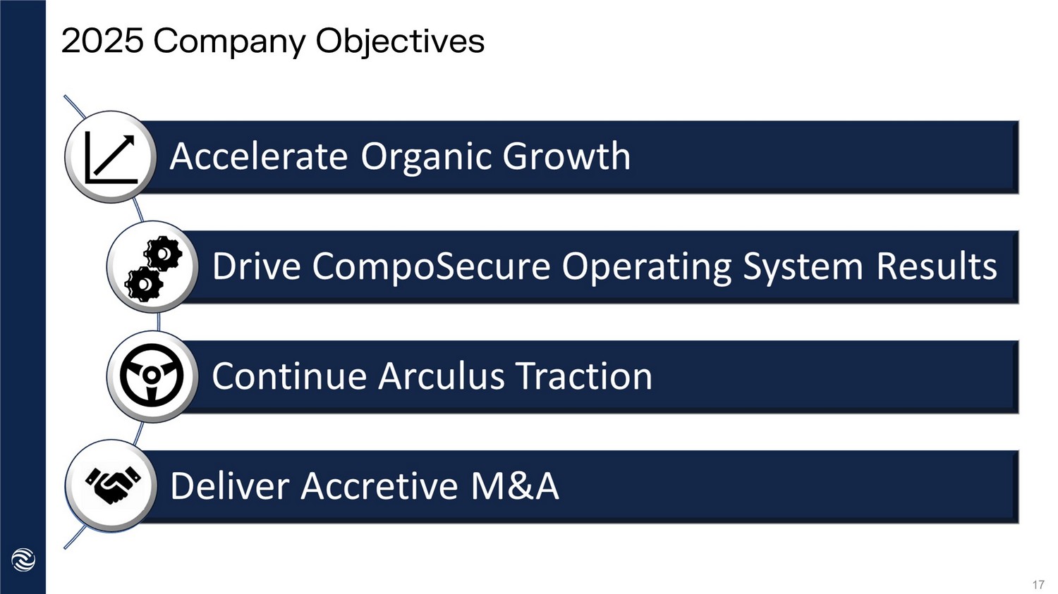 2025年指导重点关注的增长战略–通过执行CompoSecure操作系统(COS),播下推动有机和无机增长的种子全球政治和经济紧张局势(包括关税)日益加剧(包括关税)金属卡竞争对手/数字钱包Arculus的可选性–在关键任务身份验证和新兴数字资产方面的增长上行空间劳动力成本上升和对顶尖人才的竞争A实力地位挑战仍然存在既定的市场领导地位–长期和蓝筹客户群、一流的创新产品,稳健的资产负债表有利的行业背景–金属支付卡市场强劲且不断增长通胀担忧和消费者实力减弱重申此前发布的2025年全年指引:• M id-净销售额和调整后EBITDA(非公认会计准则财务数据)均实现个位数增长• S ales势头全年将继续增强•指引包括在2025年支付Resolute Holdings管理费2025年指引16