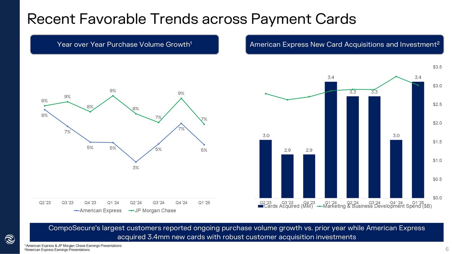 支付卡领域最近的有利趋势1 美国运通 &摩根大通收益说明会2场美国运通收益说明会购买量同比增长1 美国运通新卡收购和投资26 CompoSecure的最大客户报告称,与上一年相比,采购量持续增长而美国运通则通过稳健的获客投资获得了3.4mm新卡8% 7% 5% 5% 3% 5% 7% 5% 8% 9% 8% 9% 8% 9% 8% 7% 9% 7% Q2‘23 Q2’23 Q4‘23 Q1’24 Q2‘24 Q3’24 Q4‘24 Q1’25 TERM0 JP Morgan Chase 3.0 2.9 2.9 3.4 3.3 3.3 3.0 3.4 2.6 2.7 2.8 2.9 3.0 3.1 3.2 3.3 3.4 3.5 Q2‘23 Q3’23 Q4‘23 Q1’24 Q3‘24 Q4’24 Q1'25 $ 0.0 $ 0.5 $ 1.0 $ 1.5 $ 2.0$ 2.5 $ 3.0 $ 3.5 Card Acquired(MM)Marketing & Business Development Spend($ b)