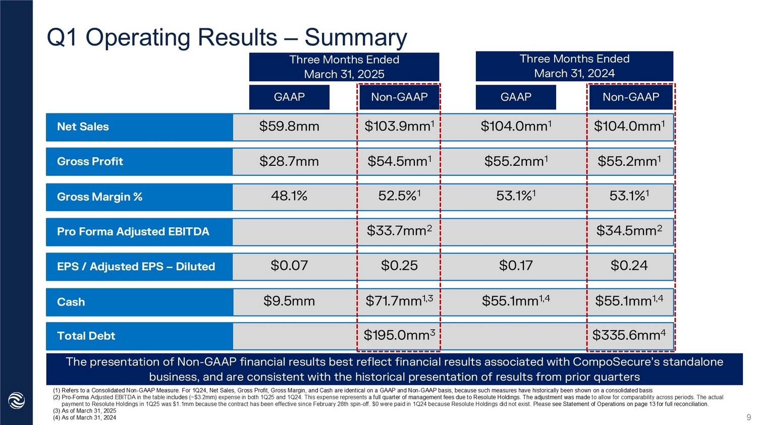 第一季度经营业绩–摘要9 GAAP Q2 YTD'22 Three M onths e nded March 3 12025 Three M onths e nded March 31,2024净销售额$ 59.8mm $ 103.9mm 1 $ 104.0mm 1 $ 104.0mm 1 $ 33.7mm 2 $ 34.5mm 2备考调整后EBITDA non-GAAP non-GAAP EPS/adjusted EPS – diluted $ 0.07 $ 0.25 $ 0.17 $ 0。24现金$ 9.5mm $ 71.7mm 1,3 $ 55.1mm 1,4 $ 55.1mm 1,4总债务$ 195.0mm 3 $ 335.6mm 4 $ 54.5mm 1 $ 55.2mm 1 $ 55.2mm 1毛利润$ 28.7mm 52.5% 153.1% 153.1% 1毛利率% 48.1%非公认会计原则财务业绩的列报最能反映与CompoSecure独立业务相关的财务业绩,并与前几个季度业绩的历史列报方式(1)一致,指的是采用综合非公认会计原则计量。对于2024年第一季度,净销售额、毛利润、毛利率和现金在GAAP和非GAAP基础上是相同的,因为这些衡量指标历来是在合并基础上显示的(2)表中的备考调整后EBITDA包括了25年第一季度和24年第一季度的(~3.2mm美元)费用。这笔费用占Resolute Holdings应付管理费的整整四分之一。进行调整是为了考虑到不同时期的可比性。1Q25向Resolute Holdings的实际付款为1.1mm美元,因为该合同自2月28日分拆以来一直有效。0美元是2024年第一季度的年平均收入,因为Resolute Holdings不存在。请参阅第13页的运营声明,了解完整的对账。(3)截至2025年3月31日(4)截至2024年3月31日
