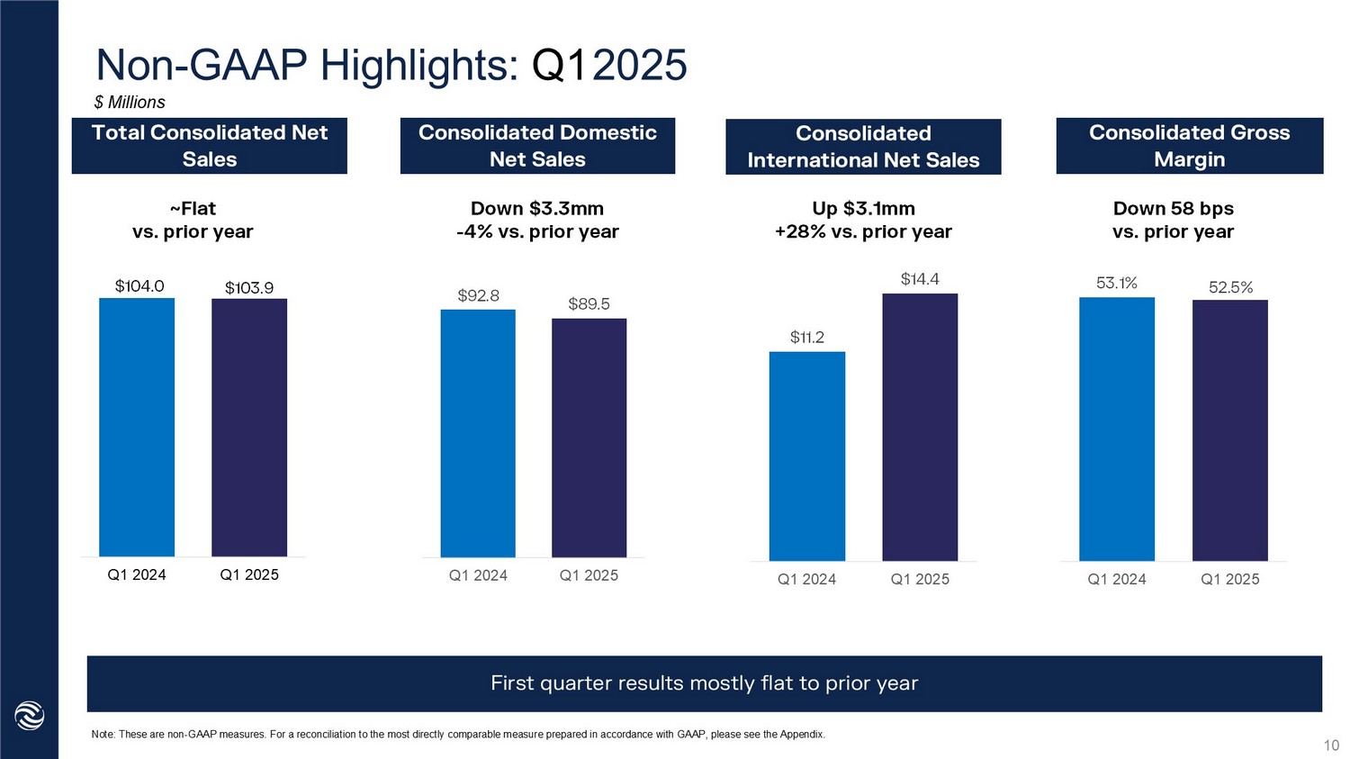 非美国通用会计准则要点:202年第一季度5 Q2年初至今' 22总合并净销售额合并毛利率合并国际净销售额~持平与上年同期相比下降58个基点与上年同期相比上升3.1美元+ 28%与上年同期相比百万美元10合并国内净销售额下降3.3美元-4 %与上年同期相比第一季度业绩基本持平104.0美元103.9美元2024年第一季度2025年第一季度92.8美元89.5美元2024年第一季度2025年第一季度11.2美元14.4美元2024年第一季度2025年第一季度53.1% 52.5% 2024年第一季度注:这些是非公认会计准则衡量标准。有关与根据公认会计原则编制的最直接可比计量的对账,请参见附录。