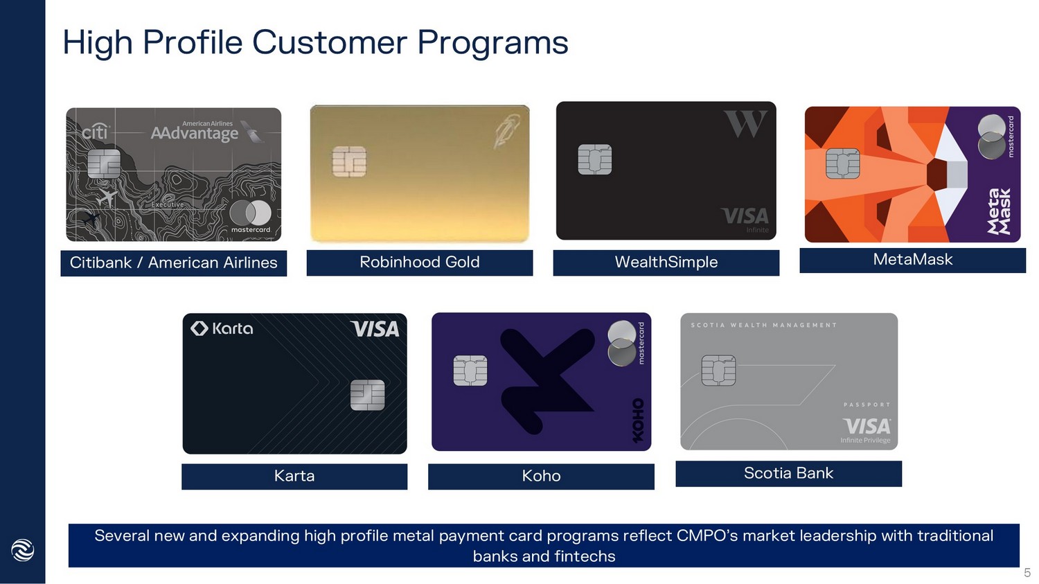 备受瞩目的客户计划5几个新的和不断扩大的备受瞩目的金属支付卡计划反映了CMPO与传统银行和金融科技公司Citibank/美国航空 Robinhood Gold MetaMask Karta Koho WealthSimple Scotia Bank的市场领导地位