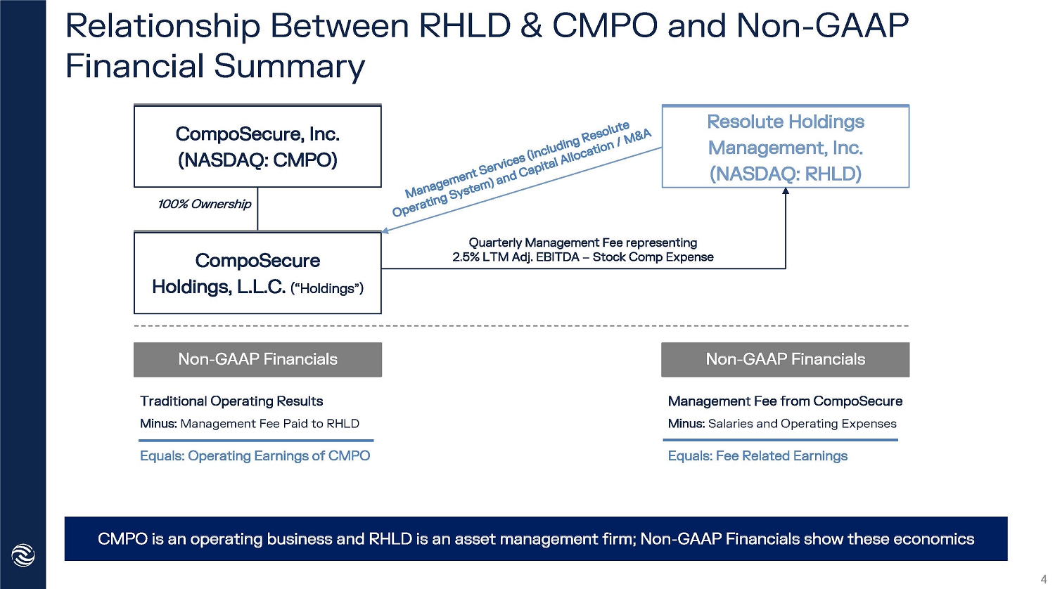 RHLD & CMPO与Non-GAAP财务摘要之间的关系4 CompoSecure,Inc.(NASDAQ:CMPO)Resolute Holdings Management,Inc.(NASDAQ:RHLD)的CompoSecure Holdings,L.L.C.(“控股”)100%所有权的季度管理费占LTM调整后的2.5%。EBITDA –股票补偿费用TERM0CMPO是一项经营业务,RHLD是一家资产管理公司;Non-GAAP财务显示这些经济性Non-GAAP财务Non-GAAP财务传统经营业绩减:支付给RHLD的管理费等于:营业收入为CMPO管理费用来自TERM0 Composecure CompoSecure减:工资和经营