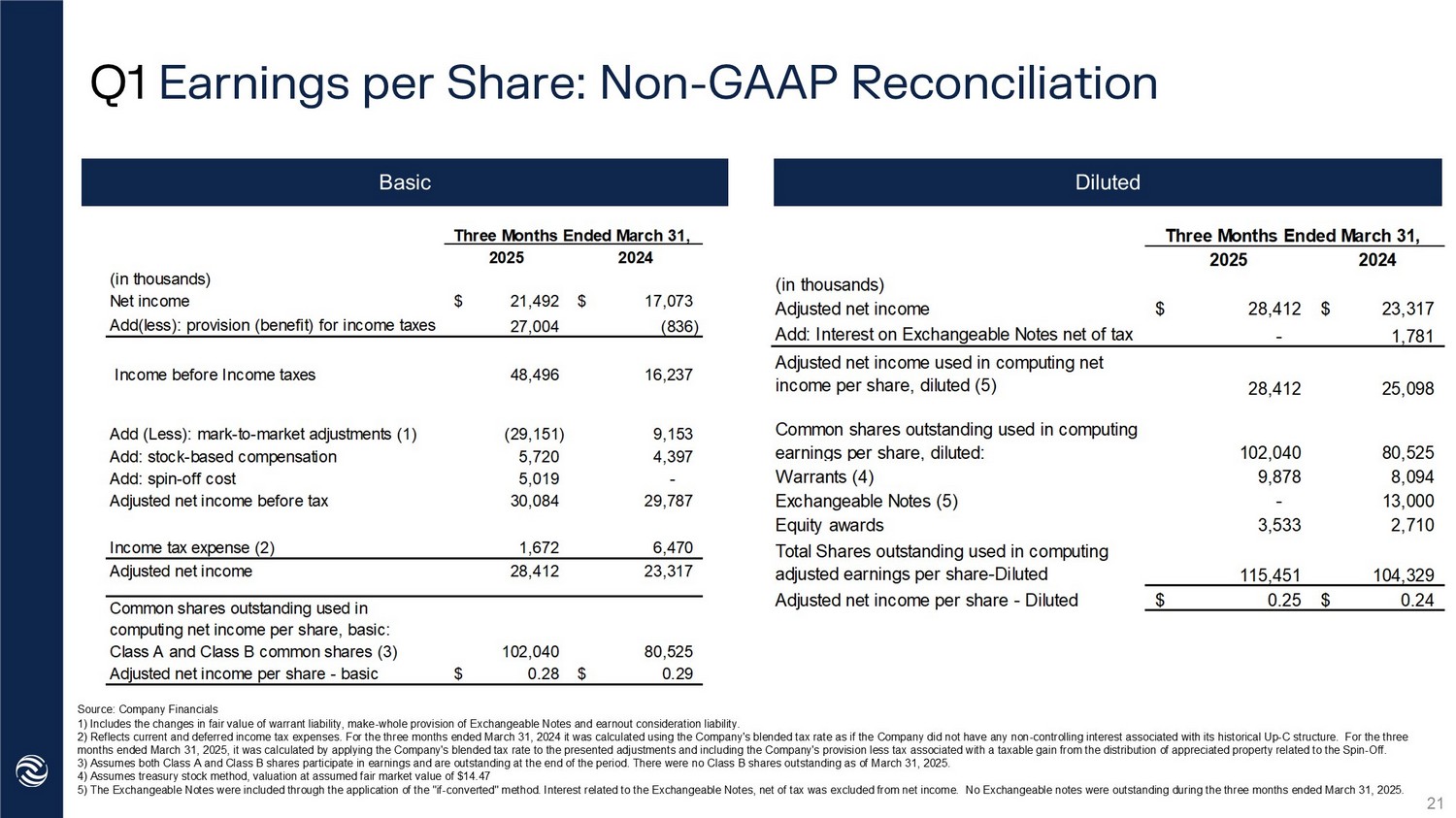 第一季度每股收益:非美国通用会计准则调节基本稀释来源:公司财务1)包括认股权证负债的公允价值变动、可交换票据的整备和盈利对价负债。2)反映当期和递延所得税费用。截至2024年3月31日止三个月,使用C omp any的混合税率计算,如同公司没有任何与其历史UP-C结构相关的非控股权益。截至2025年3月31日止三个月,其计算方法是将公司的混合税率应用于呈列的调整,并包括公司的拨备减去与与th e分拆相关的增值财产分配的应税收益相关的税项。3)假设A类和B类股票均参与收益且在期末未偿还。截至2025年3月31日,共有N O C类B股发行在外。4)假定库存股法,按假定公允市场价值14.475美元估值5)可交换票据通过应用“如果-转换”方法纳入。与Exchangeab le Notes相关的利息,税后净额不包括在净收入中。截至二零二五年三月三十一日止三个月内,概无未偿还可交换票据。2120252024(千)净收益21,492 $ 17,073 $加(减):所得税拨备(利益)27,004(836)所得税前收入48,49616,237加(减):按市值调整(1)(29,151)9,153加:股票薪酬5,7204,397加:分拆成本5,019-调整后税前净收益30,08429,787所得税费用(2)1,6726,470调整后净收益28,41223,317已发行普通股用于计算每股净收益,基本:A类和B类普通股(3)102,04080,525调整后每股净收益-基本0.28美元0.29美元截至3月31日的三个月,