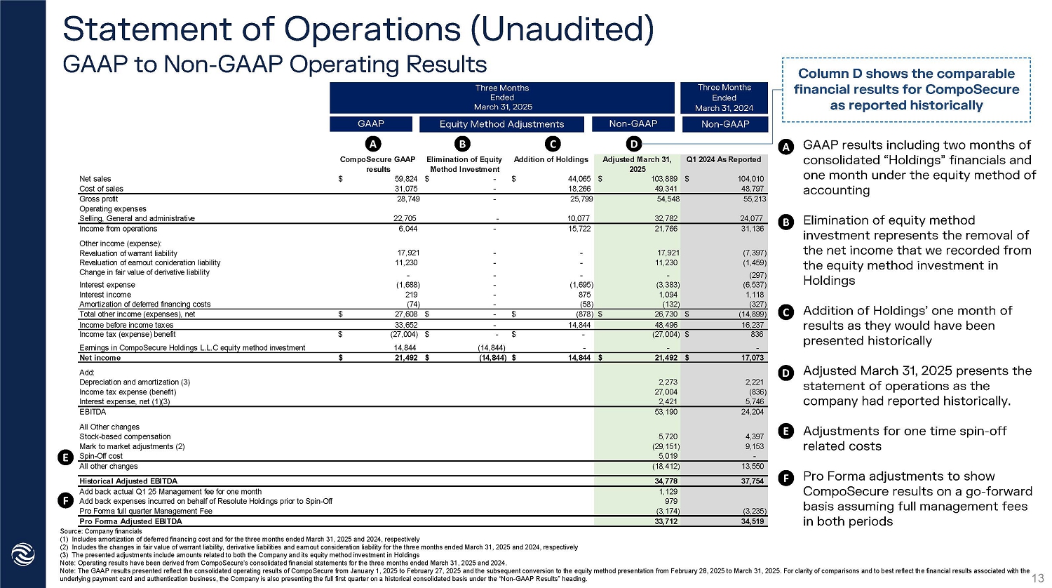新权益法会计列报12要求CompoSecure对其持股100%的全资运营子公司CompoSecure Holdings,L.L.C.(“Holdings”)及其下属子公司采用权益法核算。会计变更概要如下:»在2025年2月28日之前,我们的经营业务的业绩被合并»自2025年2月28日起,由于Resolute Holdings的分拆和管理协议,会计核算变更为权益法。因此,我们经营业务自2025年2月28日起的业绩不合并,而是在权益会计法下报告»为便于比较,我们还提供了非公认会计原则数据,以显示可比的合并经营业绩,与前几个季度业绩的历史列报方式一致»我们将我们的经营业务称为“控股”。我们在控股公司收益中所占份额在我们的运营报表中报告。我们在Holdings资产中的账面价值在我们的资产负债表中列报。呈报的GAAP业绩反映了CompoSecure在2025年1月1日至2025年2月27日期间的合并经营业绩以及随后在2025年2月28日至2025年3月31日期间转换为权益法列报的综合经营业绩。为了清楚进行比较,并最好地反映与基础支付卡和认证业务相关的财务业绩,该公司还在“非公认会计原则业绩”标题下以历史综合基础呈现整个第一季度。