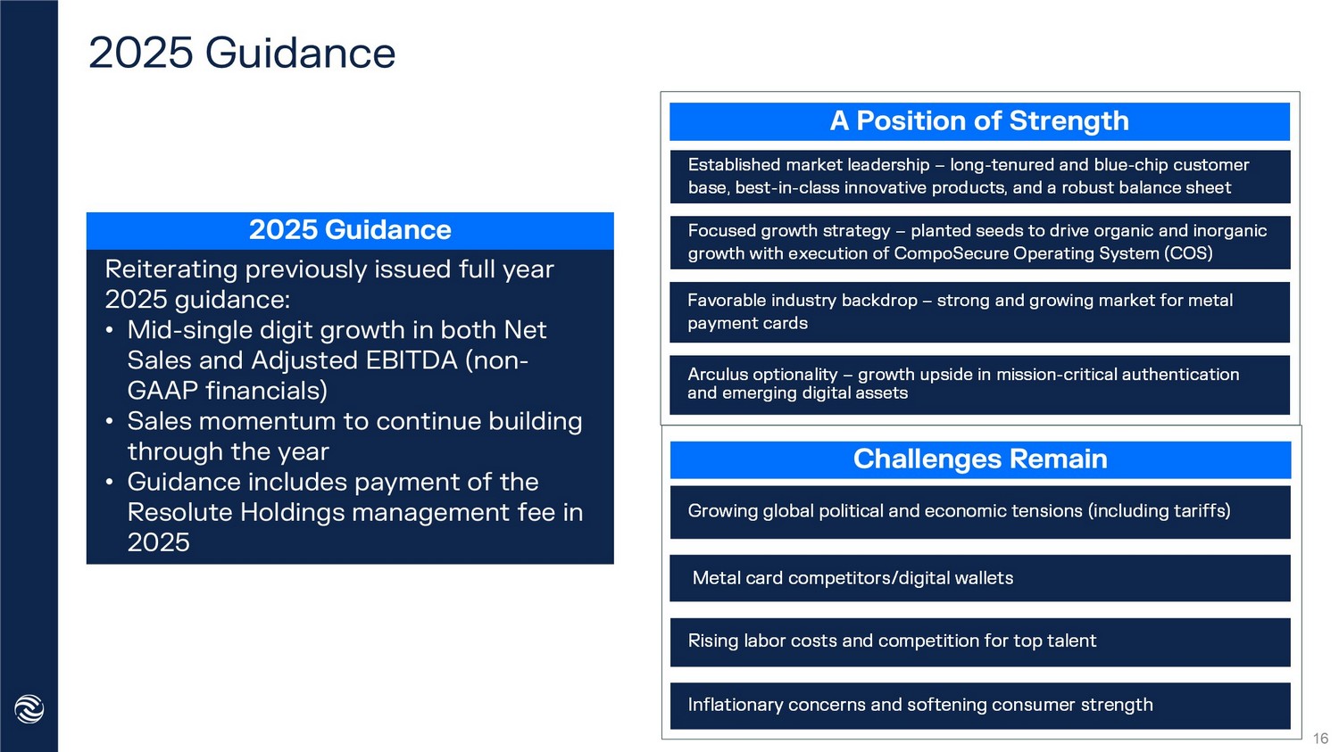 对于2025财年,CompoSecure重申合并净销售额和备考调整后EBITDA均实现中个位数增长,全年销售势头正在增强,其中包括2025年和2024年新的Resolute Holdings管理费(在备考基础上)该业务的备考调整后EBITDA 2在非公认会计原则基础上略有下降,符合预期,原因是反映对有机增长的战略投资和实施CompoSecure操作系统以推动运营效率的更高的G & A费用从Resolute Holdings Management分拆而来,Inc.(纳斯达克:RHLD)并于2月28日订立管理协议,驱动要求报告权益法1的未来财务业绩1新的权益法会计,见第13至14页的说明。2有关非GAAP措施与根据GAAP编制的最直接可比措施的对账,请参见附录。在非公认会计准则基础上,该业务的合并净销售额2与2024年第一季度持平,符合预期新的和不断扩大的高知名度客户卡项目包括花旗银行、Robinhood、Karta、Koho、WealthSimple和Scotia Bank 3为Arculus带来创纪录的业绩,在第一季度产生了净正贡献,新的垂直行业成功包括MetaMask、速汇金和Circular