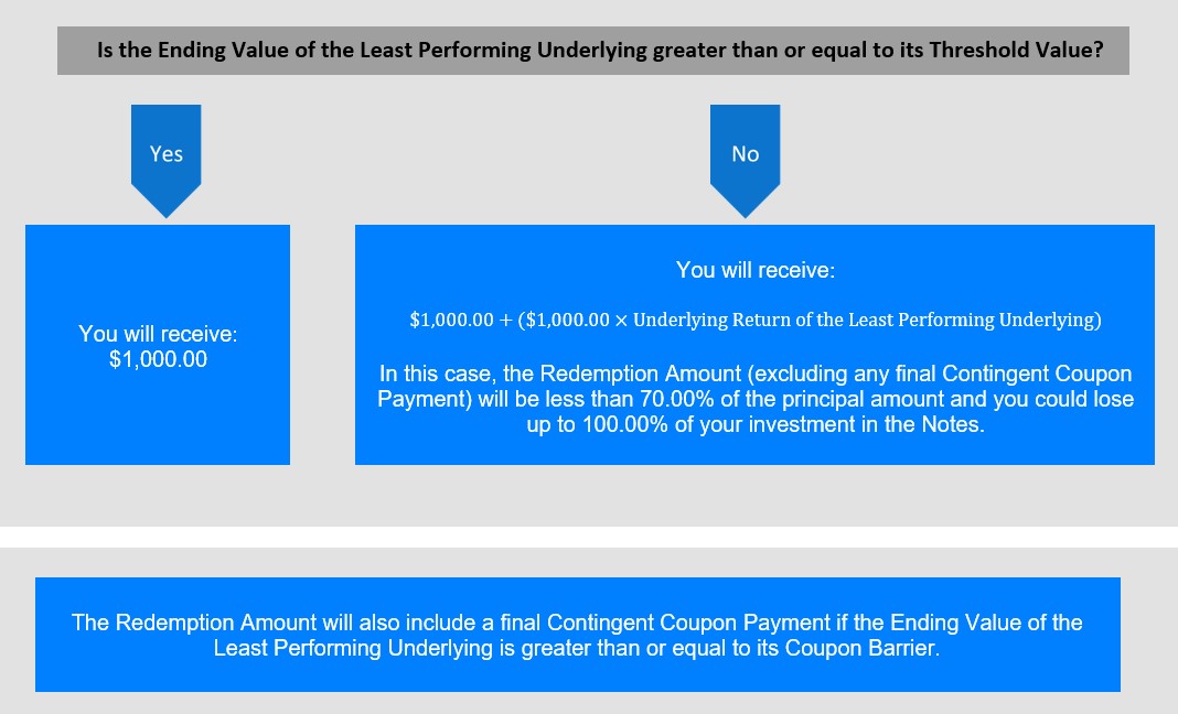 假设票据未在到期前赎回,如果任何标的较其起始价值下跌超过30%,到期时您的投资将受到表现最差标的价值下跌的1:1下行敞口,最高100%的本金面临风险;否则,到期时,您将收到本金金额。到期时,如果观察值为每个最终观察日标的大于或等于其起始值的70.00%。