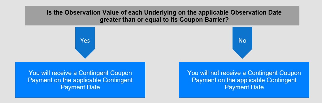 您可能不会收到任何或有息票付款。票据不提供任何定期固定息票支付。票据的投资者不一定会收到票据的任何或有息票付款。如果任何标的在某个观察日的观察值小于其票息障碍,您将不会收到适用于该观察日的或有票息支付。如果在票据期限内的所有观察日,任何标的的观察值均低于其票息壁垒,则在票据期限内,您将不会收到任何或有票息支付,也不会收到票据的正收益。