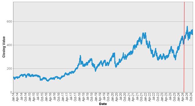 下图列出了标普 500期货35%边缘波动率6%递减指数(美元)ER的假设回测和历史表现与标普 500历史表现的比较®指数。第一张图显示了2014年1月2日至2024年11月14日期间的比较业绩数据,每一张都标准化为2014年1月2日的收盘值为100.00,以便于进行比较。第二张图显示了2022年1月3日至2024年11月14日期间的比较业绩数据,每一张都标准化为2022年1月3日的收盘值为100.00,以便于进行比较。标普 500指数的表现®下面显示的指数是其价格回报表现——即不反映股息的表现。标普 500指数的总回报表现®指数(即反映股息的表现)将大于下面显示的价格回报表现。