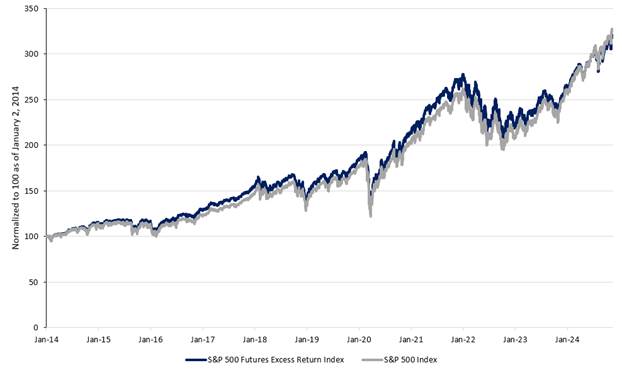 下图给出了标普 500期货超额收益指数的历史表现与标普 500历史表现的对比®指数由2014年1月2日至2024年11月14日,各正常化至2014年1月2日的收盘值为100.00,以便于比较。标普 500指数的表现®下面显示的指数是其价格回报表现——即不反映股息的表现。标普 500指数的总回报表现®指数(即反映股息的表现)将大于下面显示的价格回报表现。