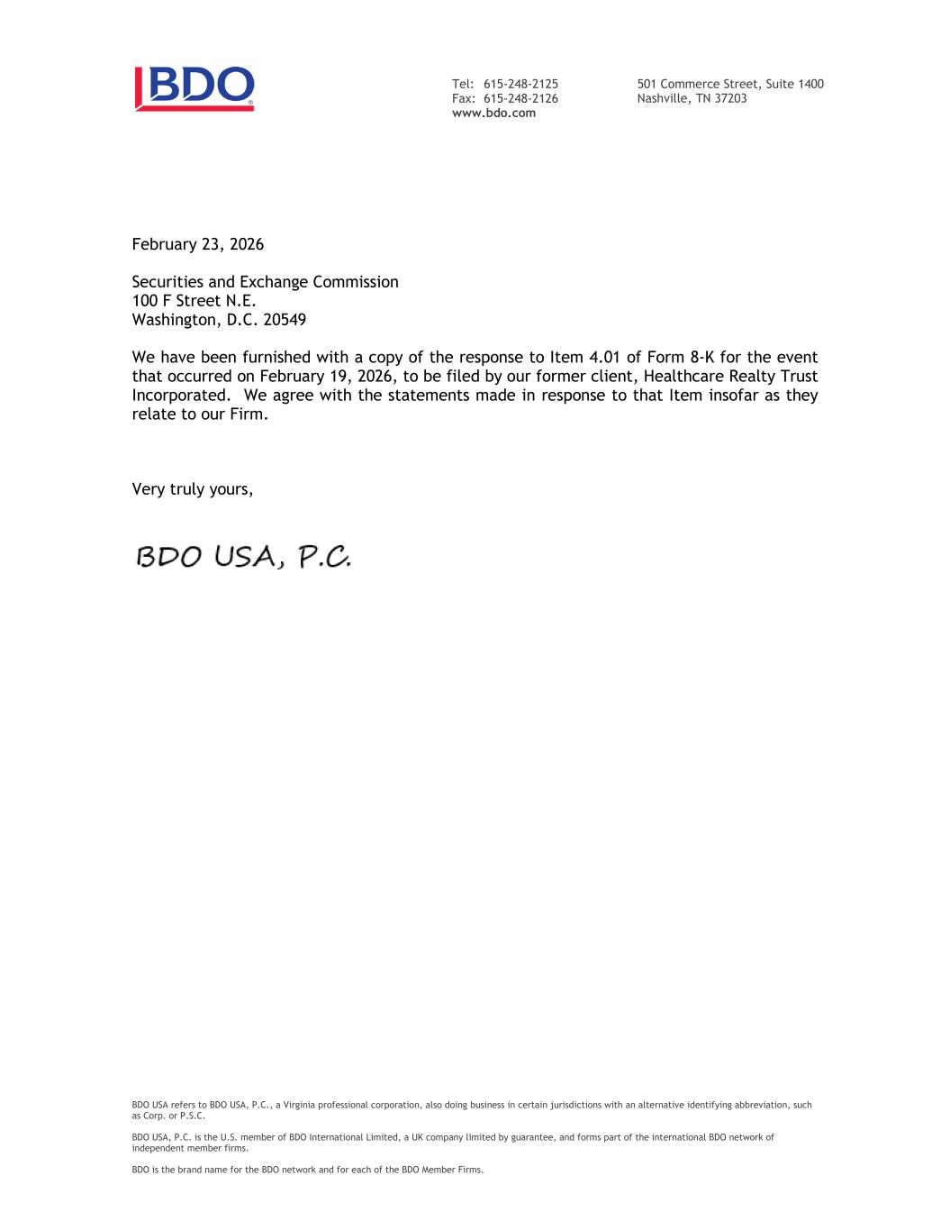 BDO USA是指BDO USA,P.C.,一家弗吉尼亚州的专业公司,也在某些具有替代识别简称的司法管辖区开展业务,例如Corp.或P.S.C. BDO USA,P.C.是英国担保有限公司BDO International Limited的美国成员,构成独立成员公司国际BDO网络的一部分。BDO是BDO网络和每个BDO成员公司的品牌名称。501 Commerce Street,Suite 1400 Nashville,TN 37203电话:615-248-2125传真:615-248-2126 www.bdo.com 2026年2月23日Securities and Exchange Commission 100 F Street N.E. Washington,D.C. 20549我们已收到一份对2026年2月19日发生的事件的表格8-K项目4.01的回复副本,该回复将由我们的前客户Healthcare Realty Trust Incorporated.归档我们同意针对该项目所作的陈述,只要它们与我们公司有关。非常真正属于你,