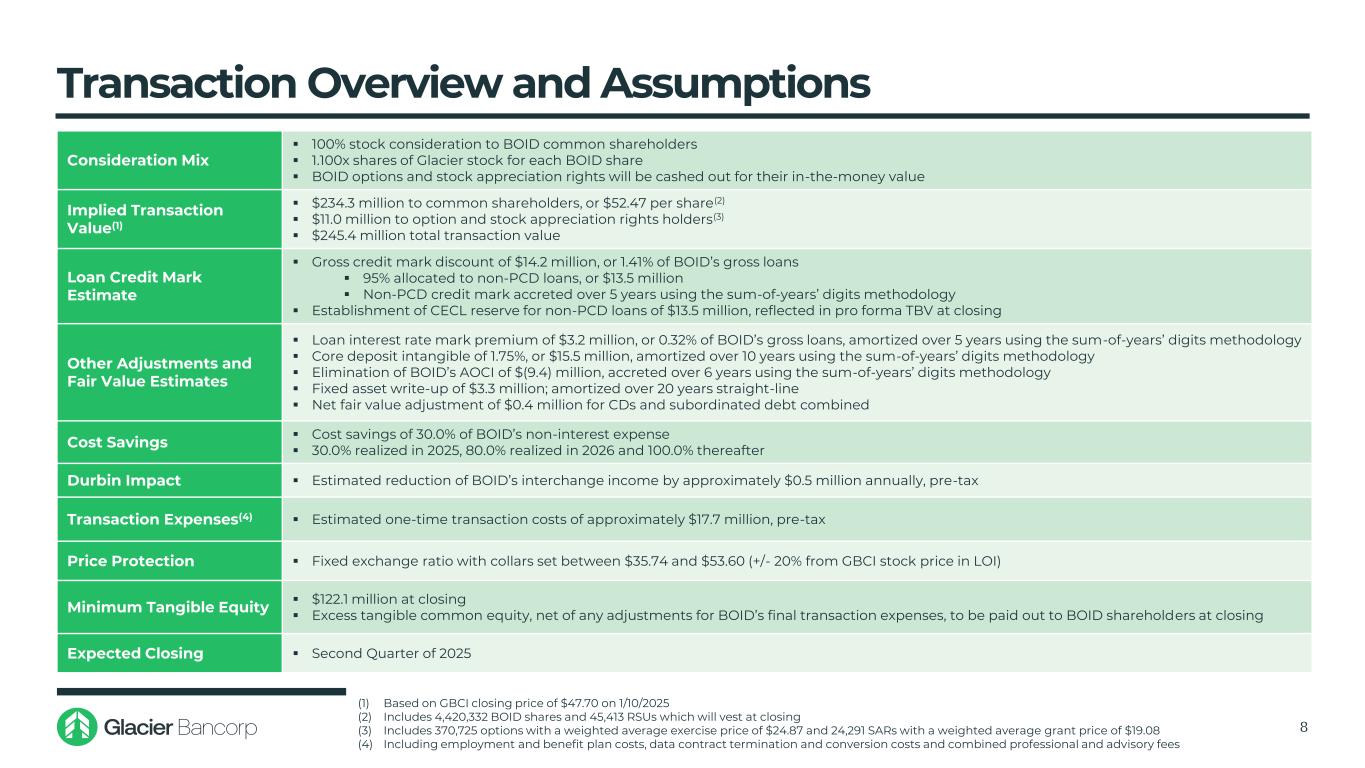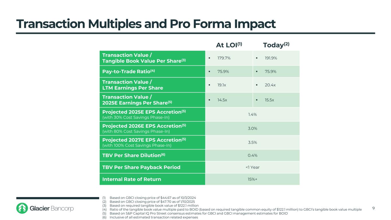 交易概览和假设8对价组合▪对BOID普通股股东的100%股票对价▪每BOID份额1.100x股Glacier股票▪BOID期权和股票增值权将兑现其价内价值隐含交易价值(一)▪给普通股股东2.343亿美元,合每股52.47美元(2)▪向期权和股票增值权持有人提供1100万美元(3)▪总交易价值2.454亿美元贷款信用标记估计▪信用标折让总额1420万美元,占BOID贷款总额的1.41%▪95%分配给非PCD贷款,或1350万美元▪非PCD信用标记在5年内使用年总和的数字方法增值▪为非PCD贷款建立CECL准备金1350万美元,在其他调整和公允价值估计结束时反映在备考TBV中▪贷款利率标记溢价320万美元,或BOID总贷款的0.32%,使用年数总和方法在5年内摊销▪核心存款无形1.75%,即1550万美元,使用年加总数字方法在10年内摊销▪消除BOID的AOCI(9.4)百万美元,使用年数总和方法在6年内增加▪固定资产减记330万美元;按20年直线摊销▪CDS和次级债合并成本节约净公允价值调整0.4百万美元▪BOID非利息支出30.0%的成本节约▪30.0%于2025年实现,80.0%于2026年实现,此后100.0%德宾影响▪预计每年减少BOID交换收入约50万美元,税前交易费用(4)▪估计一次性交易费用约为1770万美元,税前价格保护▪固定交换比率,项圈设置在35.74美元至53.60美元之间(LOI时较GBCI股价+/-20%)最低有形权益▪收盘时为1.221亿美元▪超额有形普通股本,扣除BOID最终交易费用的任何调整,将在收盘时支付给BOID股东预计收盘时▪2025年第二季度(1)根据2025年1月10日收盘价47.70美元计算(2)包括442.0332万股BOID股票和将在收盘时归属的45413股RSU(3)包括370,725份加权平均行权价为24.87美元的期权和24,291份加权平均授予价为19.08美元的SAR(4),包括就业和福利计划成本、数据合同终止和转换成本以及专业和咨询费用合计