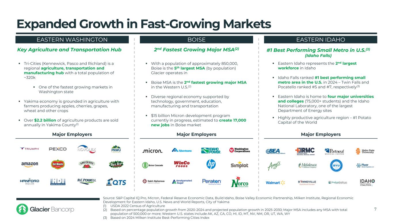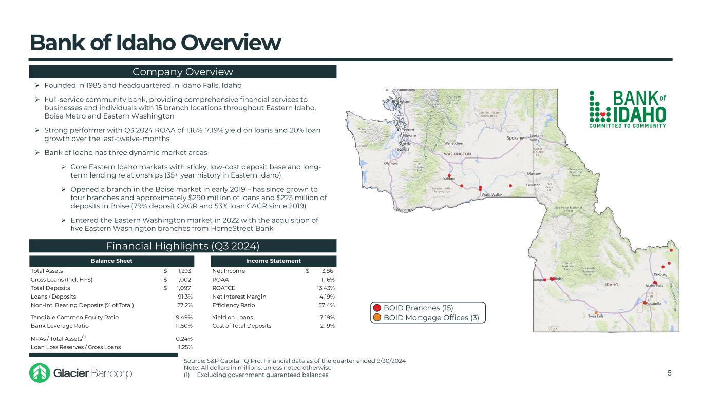 战略理由4 Glacier是一家“银行的公司”资料来源:标普 Capital IQ Pro,FDIC基于存款市场份额的截至2024年6月30日的存款数据摘要(1)。不包括以存款市场份额为基础的货币中心机构(2)。不包括货币中心机构。华盛顿东部地区包括Adams、Asotin、Benton、Chelan、Columbia、Douglas、Ferry、Franklin、Garfield、Grant、Kittitas、Klickitat、Lincoln、Okanogan、Pend Oreille、Spokane、Stevens、Walla Walla、Whitman和Yakima县↓收购补充了Glacier现有的强大贷款和存款组合,并加深了其在美国几个顶级增长市场的影响力↓符合Glacier的长期战略,即在强大的市场以卓越的团队收购优质银行丨进一步加强在爱达荷州和华盛顿东部地区的市场领先特许经营权——将Glacier定位为爱达荷州第三大银行和最大社区银行,基于存款市场份额(1)——交易定位Glacier为华盛顿东部第5大社区银行(2)—— Glacier在爱达荷州东部、博伊西地铁和华盛顿东部的现有足迹的协同扩张↓爱达荷州银行将合并为现有的三个Glacier部门:Wheatland Bank、Mountain West Bank和Citizens Community Bank