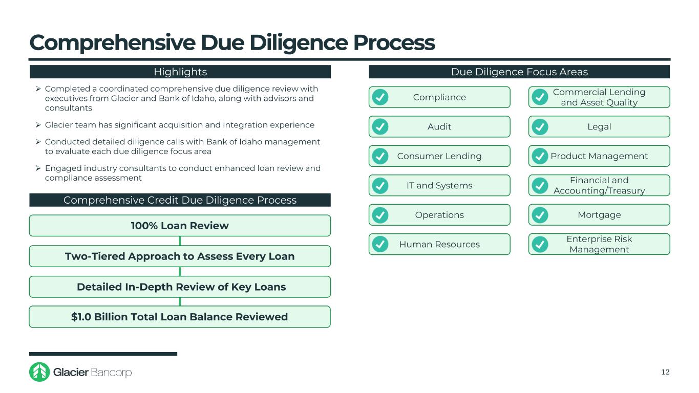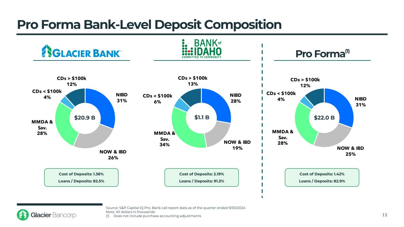 全面尽职调查流程12 ↓与Glacier和爱达荷银行的高管完成了协调一致的全面尽职调查审查,与顾问和顾问一起↓ Glacier团队拥有丰富的收购和整合经验↓与爱达荷银行管理层进行了详细的尽职调查电话,以评估每个尽职调查重点领域↓聘请行业顾问进行增强的贷款审查和合规评估综合信贷尽职调查流程100%贷款审查10亿美元总贷款余额审查尽职调查重点领域合规审计消费贷款IT和系统运营法律商业贷款和资产质量人力资源产品管理财务和会计/国库抵押突出企业风险管理两级方法评估每笔贷款详细深入审查关键贷款