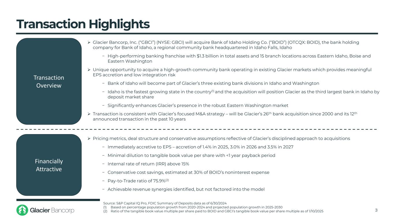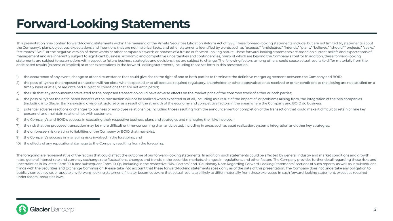 前瞻性陈述本演示文稿可能包含1995年《私人证券诉讼改革法案》含义内的前瞻性陈述。这些前瞻性陈述包括但不限于关于公司计划、目标、预期和意图的非历史事实的陈述,以及由“预期”、“预期”、“打算”、“计划”、“相信”、“应该”、“项目”、“寻求”、“估计”、“将”等词语识别的其他陈述,或这些词语的否定版本或其他类似的未来或前瞻性词语或短语。这些前瞻性陈述基于管理层当前的信念和预期,本质上受到重大业务、经济和竞争不确定性和意外事件的影响,其中许多超出了公司的控制范围。此外,这些前瞻性陈述受制于与未来业务战略和决策相关的假设,这些假设可能会发生变化。除其他外,以下因素可能导致实际结果与前瞻性陈述中的预期结果(明示或暗示)或其他预期存在重大差异,包括本演示文稿中所述的那些因素:1)可能导致一方或双方有权终止公司与BOID之间的最终合并协议的任何事件、变化或其他情况的发生;2)由于需要监管,拟议交易不会在预期时完成或根本不会完成的可能性,未收到股东或其他批准或未及时或根本不满足交割的其他条件,或在未预期的条件下获得;3)与拟议交易相关的任何公告可能对一方或双方的普通股市场价格产生不利影响的风险;4)交易的预期收益无法在预期时实现或根本无法实现的可能性,包括由于以下因素的影响或产生的问题,两家公司的整合(包括纳入Glacier Bank现有的部门结构)或由于公司与BOID开展业务的地区的经济实力和竞争因素;5)对业务或员工关系的潜在不良反应或变化,包括因宣布或完成交易而可能导致难以留住或聘用关键人员以及维持与客户关系的风险;6)公司和BOID成功执行各自的业务计划和战略以及管理所涉及的风险;7)拟议交易可能比预期更困难或更耗时的风险,包括在资产变现等领域,系统集成和其他关键战略;8)可能存在的与公司或BOID负债有关的不可预见的风险;9)公司成功地管理了上述涉及的风险;以及10)上述导致的任何声誉损害对公司的影响。上述内容代表了可能影响我们前瞻性陈述结果的因素。此外,此类报表可能受到一般行业和市场状况及增长率、一般利率和货币汇率波动、证券市场变化和趋势、法规变化等因素的影响。该公司在其最新的10-K表格和随后的10-Q表格中提供了有关这些风险和不确定性的进一步细节,包括在这些报告的相应“风险因素”和“关于前瞻性陈述的注意事项”部分,以及随后提交给美国证券交易委员会的文件中。请考虑到这些前瞻性陈述仅在本演示文稿发布之日发表。如果公司后来意识到实际结果可能与此类前瞻性陈述中表达的结果存在重大差异,则公司不承担任何公开更正、修改或更新任何前瞻性陈述的义务,除非联邦证券法要求。2