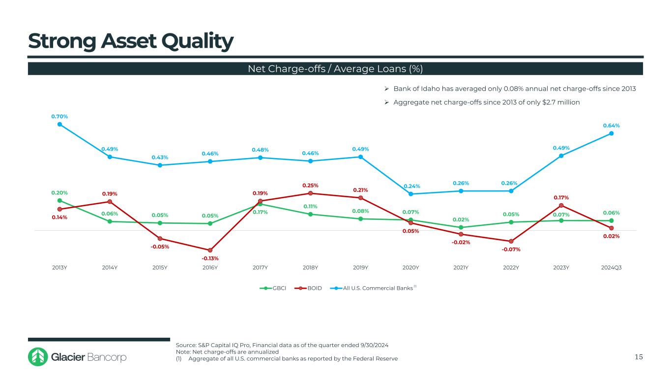 非OO CRE 23% OO CRE 18% C & I 8% 1-4 FAM。21% Multifam。5%建发10%消费者1%农场&农业。6%其他7%非OO CRE 19% OO CRE 23% C & I 13% 1-4档。13% Multifam。6%建发股份14%消费者1%农场农业。9%其他1%非OO CRE 23% OO CRE 18% C & I 8% 1-4档。20% Multifam。5%建发11%消费者1%农农股份。6%其他7%贷款收益率:5.81%贷款收益率:7.19%贷款收益率:5.73%备考银行级贷款构成14备考(1)资料来源:标普 Capital IQ Pro,截至2024年9月30日止季度的银行电话报告数据注:所有以千美元计(1)不包括采购会计调整$ 17.2B $ 1.0B $ 18.2B