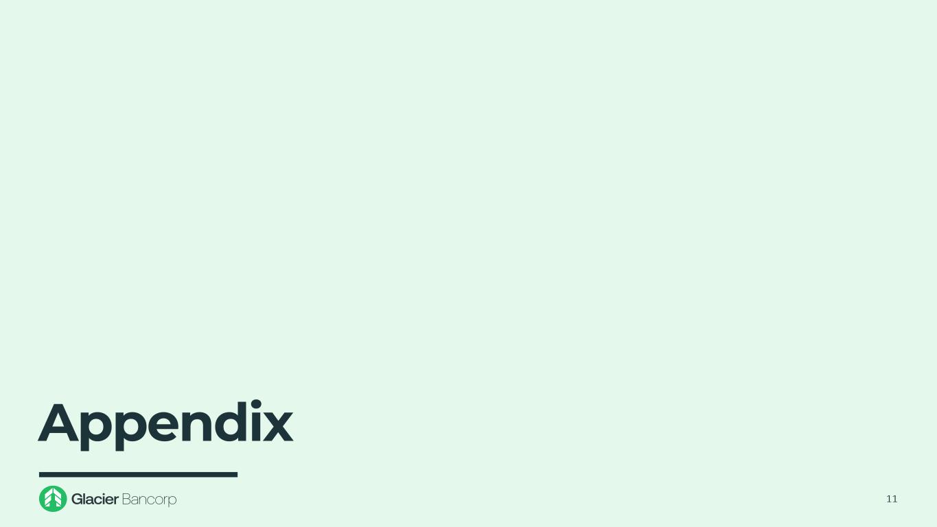 结论性意见10丨收购爱达荷银行延续了Glacier的悠久传统,即增加符合Glacier社区银行模式的一流银行↓收购在现有冰川市场运营的高增长社区银行的独特机会,该银行可提供有意义的EPS增值和低整合风险↓定价指标、交易结构和保守假设反映了Glacier的一贯,严谨的收购方式丨交易将进一步提升Glacier在创造股东价值方面的长期业绩记录丨收购落基山地区表现最好的银行之一的独特机会↓收购显着扩大了Glacier在爱达荷州和华盛顿州的业务——两个关键的增长州− Glacier将成为爱达荷州第三大银行(1),是全国增长最快的州(2)−为Glacier的Wheatland Bank部门增加规模,该部门于2024年初加入该组织丨爱达荷银行管理层和员工为Glacier提供了一支经验丰富的贷方团队,深厚的市场知识和强大的客户关系来源:标普 Capital IQ Pro(1)FDIC截至2024年6月30日的存款数据摘要(2)基于2020-2024年人口增长百分比和2025-2030年预计人口增长