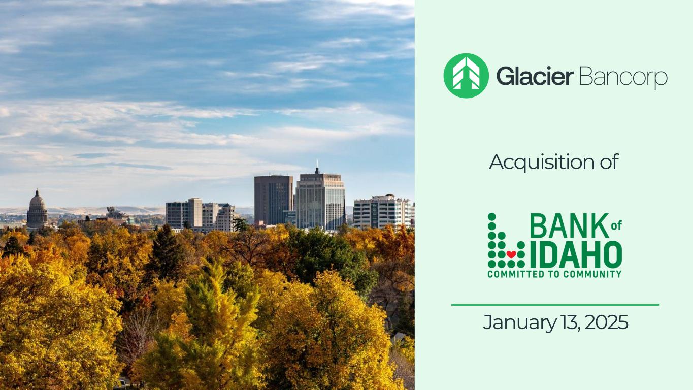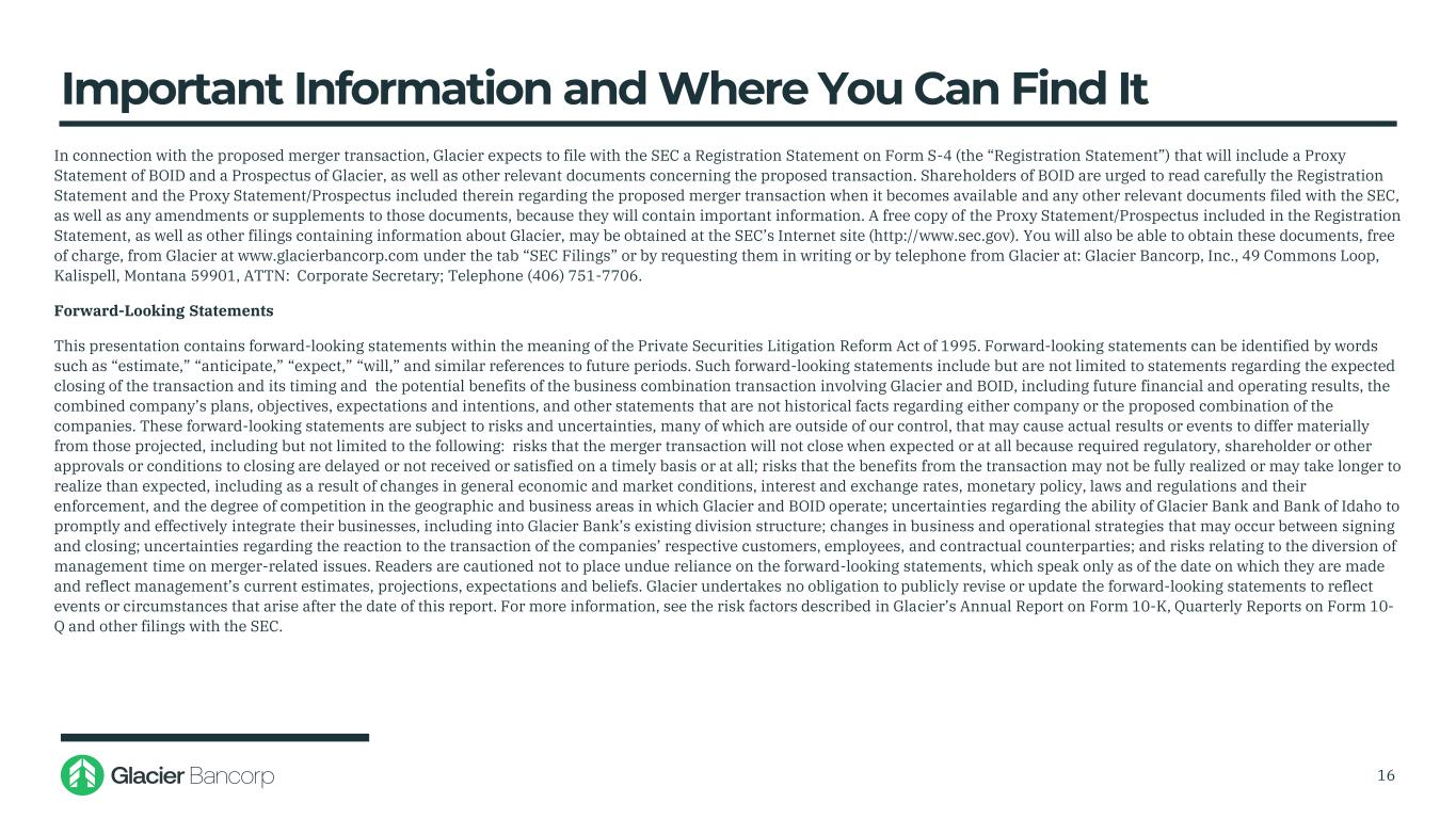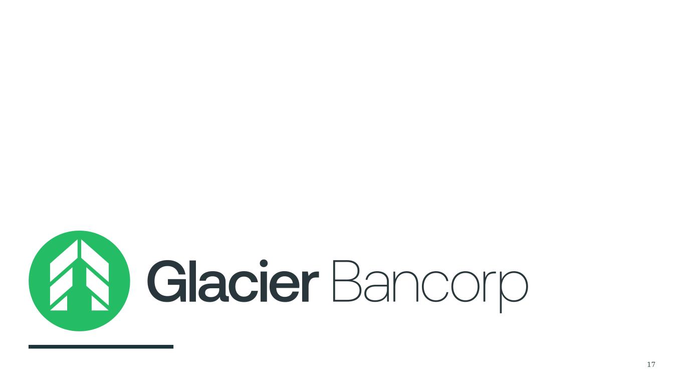 重要信息以及在哪里可以找到16关于拟议的合并交易,Glacier预计将向SEC提交一份表格S-4的注册声明(“注册声明”),其中将包括BOID的代理声明和Glacier的招股说明书,以及与拟议交易有关的其他相关文件。BOID的股东被敦促仔细阅读注册声明和其中包含的关于拟议合并交易的代理声明/招股说明书,当它可获得时,以及向SEC提交的任何其他相关文件,以及对这些文件的任何修订或补充,因为它们将包含重要信息。可在SEC的网站(http://www.sec.gov)上免费获得注册声明中包含的代理声明/招股说明书的副本,以及包含有关Glacier信息的其他文件。您还可以在www.glacierbancorp.com的“SEC文件”标签下从Glacier免费获取这些文件,或者通过以下地址向Glacier提出书面要求或电话索取这些文件:Glacier Bancorp, Inc.,49 Commons Loop,Kalispell,Montana 59901,ATTN:公司秘书;电话(406)751-7706。前瞻性陈述本演示文稿包含1995年《私人证券诉讼改革法案》含义内的前瞻性陈述。前瞻性陈述可以通过“估计”、“预期”、“预期”、“将”等词语以及对未来期间的类似提及来识别。此类前瞻性陈述包括但不限于有关交易预期完成及其时间的陈述以及涉及Glacier和BOID的业务合并交易的潜在利益,包括未来的财务和经营业绩、合并后公司的计划、目标、期望和意图,以及关于任何一家公司或拟议的公司合并的其他非历史事实的陈述。这些前瞻性陈述受到风险和不确定性的影响,其中许多风险和不确定性超出我们的控制范围,可能导致实际结果或事件与预测的结果或事件存在重大差异,包括但不限于:由于所需的监管、股东或其他批准或完成的条件被延迟或未及时或根本未收到或满足,合并交易将无法在预期时或根本无法完成的风险;交易收益可能无法完全实现或可能需要比预期更长的时间才能实现的风险,包括由于一般经济和市场条件、利率和汇率、货币政策、法律法规及其执行情况的变化,以及Glacier和BOID经营所在的地理和业务领域的竞争程度;有关Glacier Bank和Bank of Idaho迅速有效整合其业务的能力的不确定性,包括纳入Glacier Bank现有的部门结构;在签署和关闭之间可能发生的业务和运营战略的变化;有关公司各自客户、员工对交易的反应的不确定性,和合同对手方;以及与合并相关问题的管理时间分流有关的风险。告诫读者不要过分依赖前瞻性陈述,这些陈述仅代表作出这些陈述之日的情况,反映了管理层目前的估计、预测、期望和信念。Glacier不承担公开修改或更新前瞻性陈述以反映本报告日期之后发生的事件或情况的义务。有关更多信息,请参阅Glacier的10-K表格年度报告、10-Q表格季度报告以及向SEC提交的其他文件中描述的风险因素。