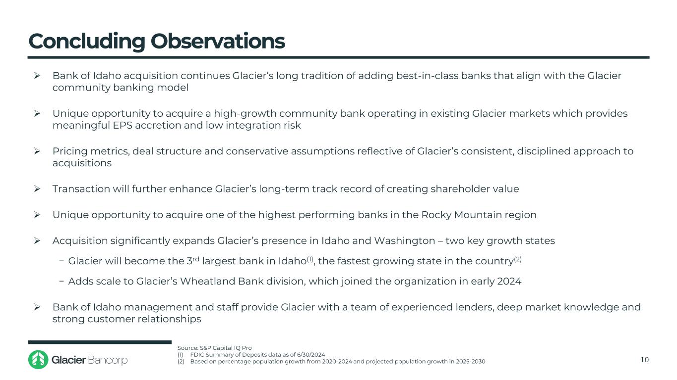交易倍数和备考影响9在意向书(1)今天(2)交易价值/每股有形帐面价值(3)▪179.7%▪191.9%付贸比(4)▪75.9%▪75.9%成交金额/LTM每股盈利▪19.1x▪20.4x成交金额/2025E每股盈利(5)▪14.5x▪15.5x预计2025E EPS增值(5)(分阶段有30%的成本节约)1.4%预计2026E EPS增值(5)(分阶段有80%的成本节约)3.0%预计2027E EPS增值(5)(分阶段有100%的成本节约)3.5% TBV每股摊薄(6)0.4% TBV每股回收期< 1年内部收益率15% +(1)基于GBCI收盘截至2024年10月3日(2)的价格为44.67美元,基于截至2025年1月10日GBCI收盘价47.70美元(3)基于所需的有形账面价值1.221亿美元(4)支付给BOID的有形账面价值倍数(基于所需的有形普通股权益1.221亿美元)与GBCI有形账面价值倍数(5)的比率基于标普TERM2 Capital IQ Pro Street对BOID的一致估计和GBCI管理层对BOID的估计(6),包括所有估计的交易相关费用