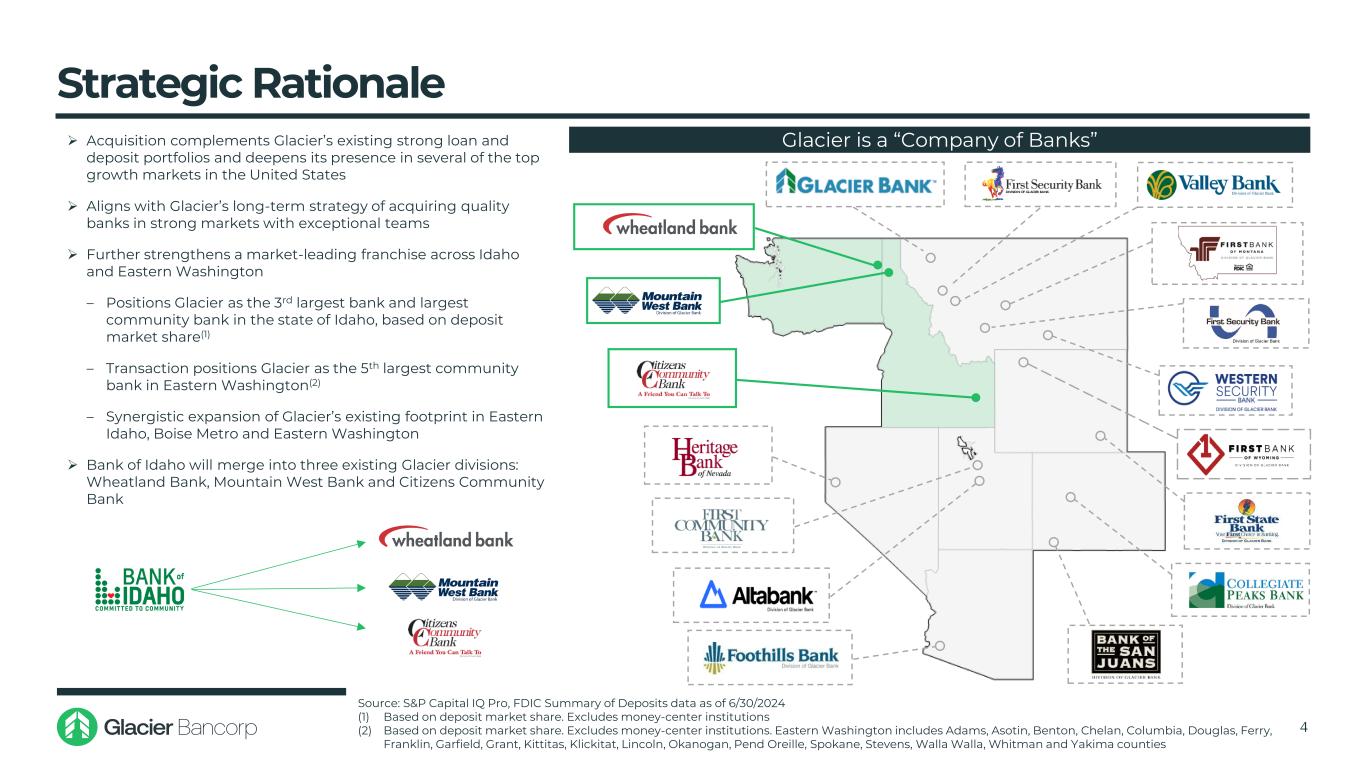 交易亮点3交易概况财务有吸引力↓ Glacier Bancorp, Inc.(“GBCI”)(NYSE:GBCI)将收购爱达荷州银行控股有限公司(“BOID”)(OTCQX:BOID),这是一家总部位于爱达荷福尔斯的区域性社区银行爱达荷州的银行控股公司,该银行拥有13亿美元总资产并在爱达荷州东部设有15家分行,博伊西和华盛顿东部丨收购一家在现有冰川市场运营的高增长社区银行的独特机会,该银行提供了有意义的每股收益增长和低整合风险−爱达荷银行将成为冰川在爱达荷州和华盛顿州现有三个银行部门的一部分−爱达荷州是该国增长最快的州(1)此次收购将使Glacier成为按存款市场份额计算的爱达荷州第三大银行−显着增强了Glacier在强劲的华盛顿东部市场的影响力↓交易符合Glacier专注的并购战略——这将是Glacier自2000年以来的第26次银行收购,也是其过去10年中宣布的第12次交易↓定价指标、交易结构和反映Glacier严格收购方法的保守假设−立即增加EPS – 2025年增长1.4%,2026年3.0%和2027年3.5% −对每股有形账面价值的稀释最小且投资回收期< 1年−内部收益率(IRR)高于15% −保守的成本节约,按BOID非利息费用的30% −支付贸易比率75.9%估算(2)−已确定可实现的收入协同效应,但未将其纳入模型资料来源:标普 Capital IQ Pro,FDIC截至2024年6月30日的存款数据摘要(1)基于2020-2024年人口增长百分比和2025-2030年预计人口增长(2)截至2025年1月10日支付的每股有形账面价值倍数与BOID的比率和GBCI的每股有形账面价值倍数