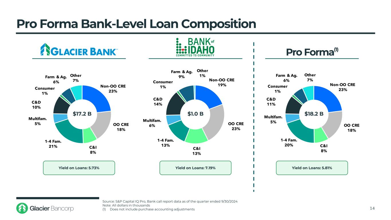 NIBD31 % Now & IBD 26% MMDA & SAV。28% CDS < $ 100k 4% CDS > $ 100k 12% NIBD28 % Now & IBD 19% MMDA & SAV。34% CDS < $ 100k 6% CDS > $ 100k 13% NIBD31 % Now & IBD 25% MMDA & SAV。28% CDS < $ 100k 4% CDS > $ 100k 12%备考银行级存款构成13资料来源:标普 Capital IQ Pro,截至2024年9月30日止季度的银行电话报告数据注:所有以千美元计(1)不包括采购会计调整存款成本:1.42%贷款/存款:82.9%存款成本:2.19%贷款/存款:91.3%存款成本:1.38%贷款/存款:82.5%备考(1)$ 20.9 B $ 1.1 B $ 22.0 B