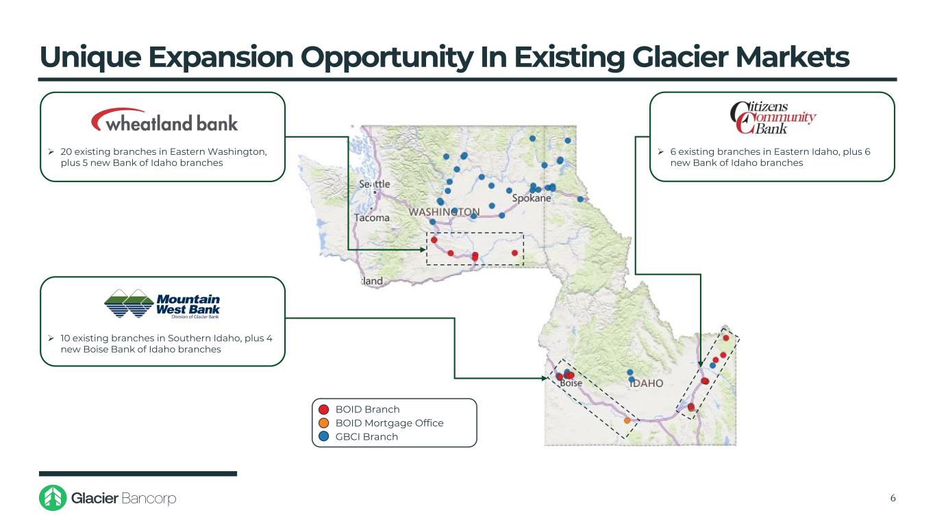 现有冰川市场的独特扩张机会6BOID分行BOID抵押贷款办公室GBCI分行丨华盛顿东部现有20家分行,加上5家新的爱达荷银行分行丨爱达荷东部现有6家分行,加上6家新的爱达荷银行分行丨爱达荷南部现有10家分行,加上4家新的爱达荷博伊西银行分行